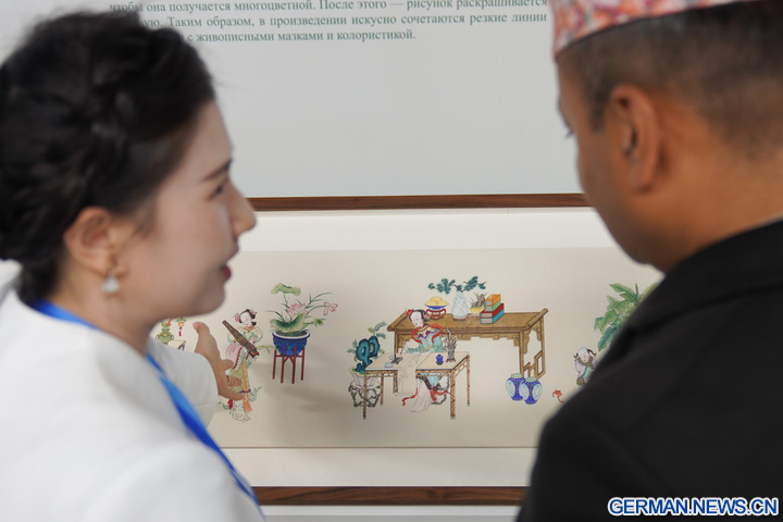 TIANJIN, 1. September 2025 (Xinhua) -- Eine Mitarbeiterin zeigt einem Journalisten Neujahrs-Holzschnitte aus Yangliuqing im Pressezentrum des Gipfels der Shanghaier Organisation für Zusammenarbeit (SOZ) 2025 in Tianjin in Nordchina, 31. August 2025. Der SOZ-Gipfel 2025 findet vom 31. August bis zum 1. September in Tianjin statt. Das Pressezentrum des Gipfels bot eine Erlebniszone zum Thema immaterielles Kulturerbe, in der Journalisten die Möglichkeit hatten, sich mit lokalen Handwerkskünsten des immateriellen Kulturerbes wie Neujahrs-Holzschnitten aus Yangliuqing, Zhang-Tonfiguren und der Herstellung von Lackarbeiten vertraut zu machen. (Xinhua/Dai Mingxuan)