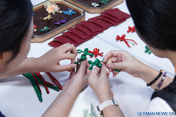 TIANJIN, 1. September 2025 (Xinhua) -- Journalistinnen fertigen Knotenknopfbroschen im Pressezentrum des Gipfels der Shanghaier Organisation für Zusammenarbeit (SOZ) 2025 in Tianjin in Nordchina, 30. August 2025. Der SOZ-Gipfel 2025 findet vom 31. August bis zum 1. September in Tianjin statt. Das Pressezentrum des Gipfels bot eine Erlebniszone zum Thema immaterielles Kulturerbe, in der Journalisten die Möglichkeit hatten, sich mit lokalen Handwerkskünsten des immateriellen Kulturerbes wie Neujahrs-Holzschnitten aus Yangliuqing, Zhang-Tonfiguren und der Herstellung von Lackarbeiten vertraut zu machen. (Xinhua/Dai Mingxuan)