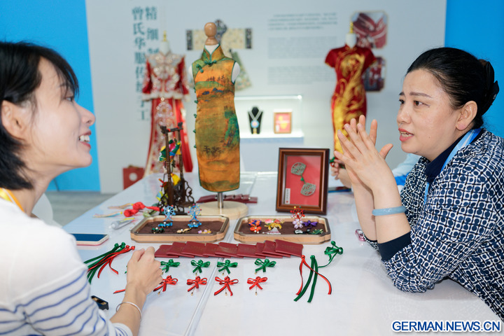 TIANJIN, 1. September 2025 (Xinhua) -- Eine Mitarbeiterin (rechts) erklärt einer Journalistin die Herstellung einer Knotenknopfbrosche im Pressezentrum des Gipfels der Shanghaier Organisation für Zusammenarbeit (SOZ) 2025 in Tianjin in Nordchina, 31. August 2025. Der SOZ-Gipfel 2025 findet vom 31. August bis zum 1. September in Tianjin statt. Das Pressezentrum des Gipfels bot eine Erlebniszone zum Thema immaterielles Kulturerbe, in der Journalisten die Möglichkeit hatten, sich mit lokalen Handwerkskünsten des immateriellen Kulturerbes wie Neujahrs-Holzschnitten aus Yangliuqing, Zhang-Tonfiguren und der Herstellung von Lackarbeiten vertraut zu machen. (Xinhua/Zhang Xiaoyu)