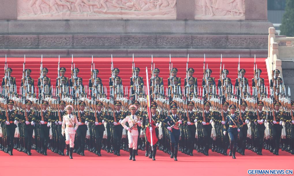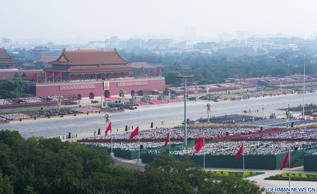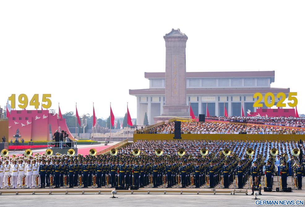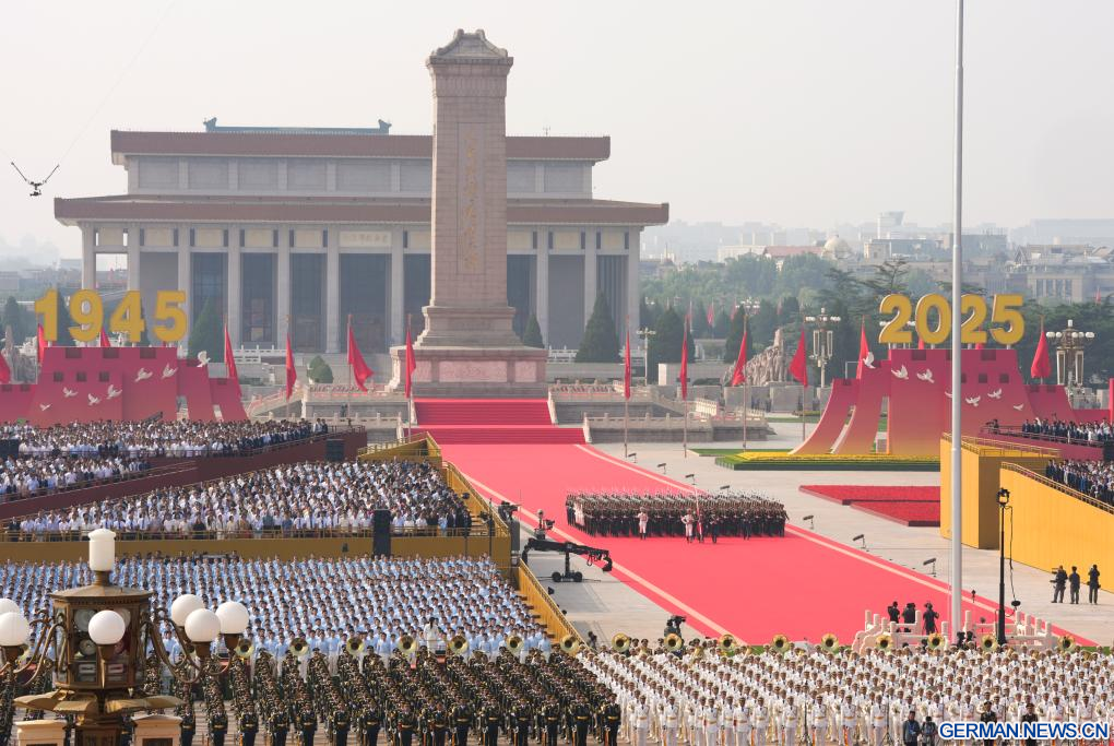 BEIJING, 3. September 2025 (Xinhuanet) -- Am Mittwochmorgen begann auf dem Tian'anmen-Platz in Beijing ein großes Gedenktreffen zum 80. Jahrestag des Sieges im Widerstandskrieg des chinesischen Volkes gegen die japanische Aggression und im weltweiten antifaschistischen Krieg.