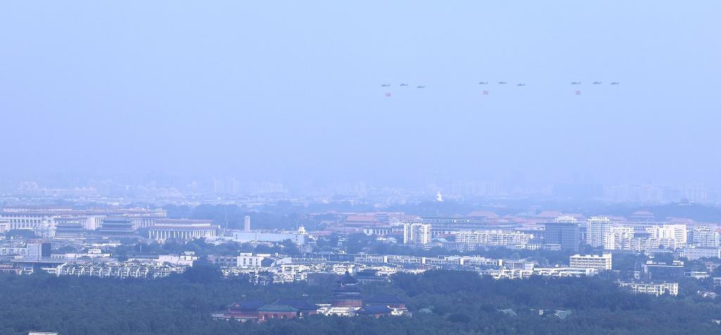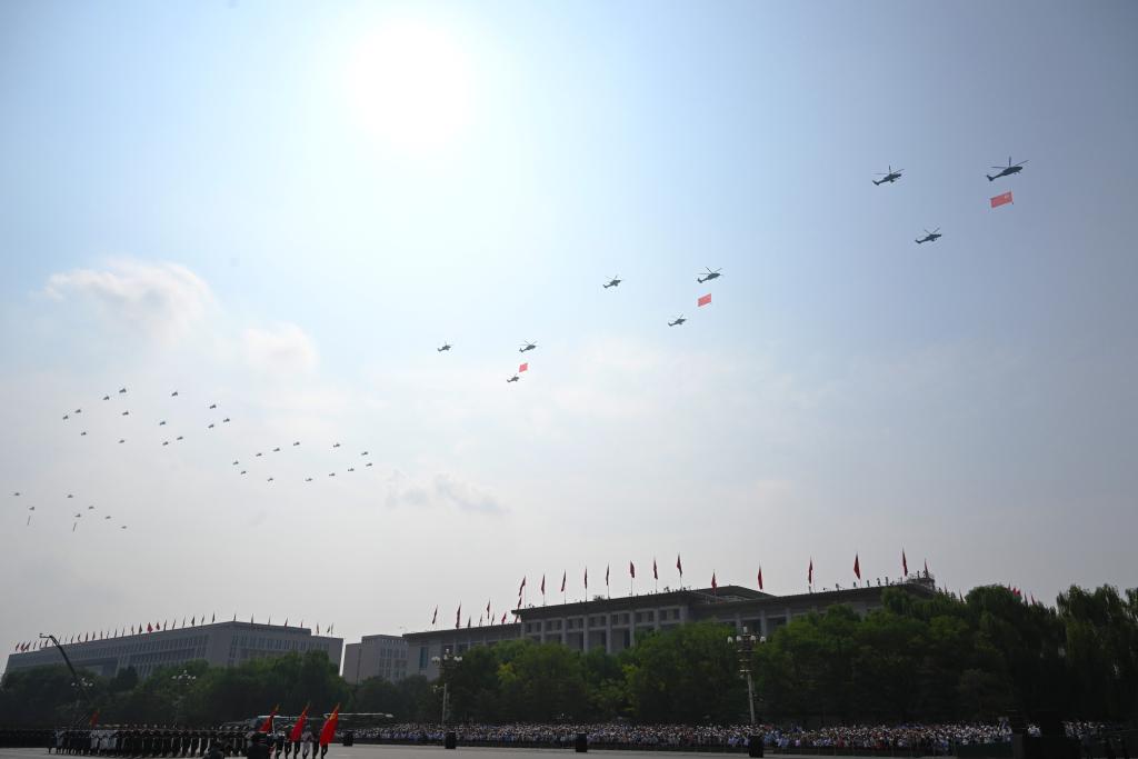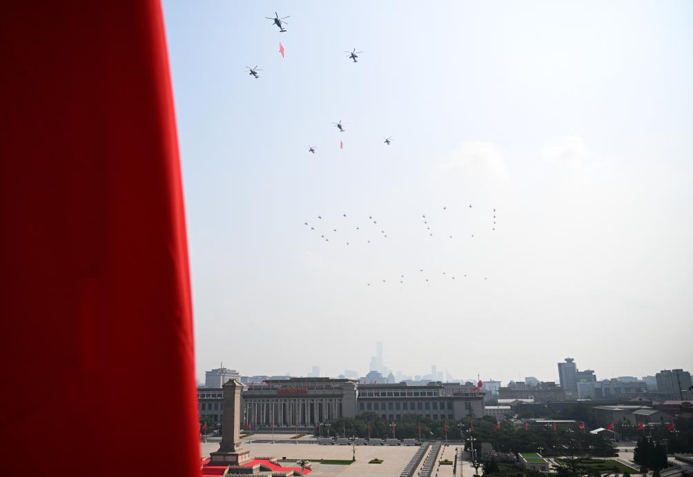 BEIJING, 3. September 2025 (Xinhuanet) -- Die Fahnenwache-Luftstaffel fliegt über den Tian'anmen-Platz während einer großen Versammlung zum Gedenken an den 80. Jahrestag des Sieges im Widerstandskrieg des chinesischen Volkes gegen die japanische Aggression und im weltweiten antifaschistischen Krieg in der chinesischen Hauptstadt Beijing, 3. September 2025. (Quelle: Xinhua/Yang Guanyu)