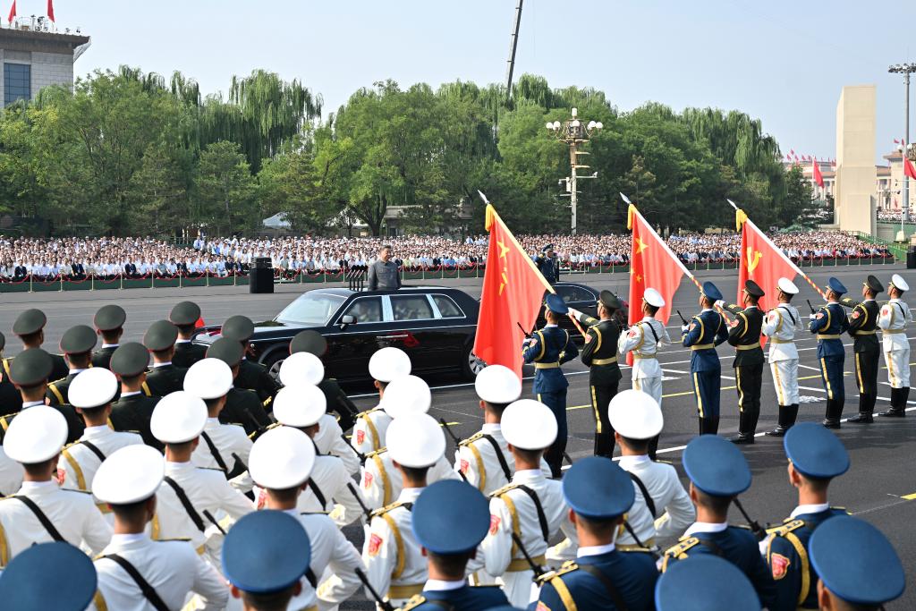 Xi, der auch Generalsekretär des Zentralkomitees der Kommunistischen Partei Chinas und Vorsitzender der Zentralen Militärkommission ist, stand in einer Hongqi-Limousine und gab den Befehl zum Beginn der Inspektion.