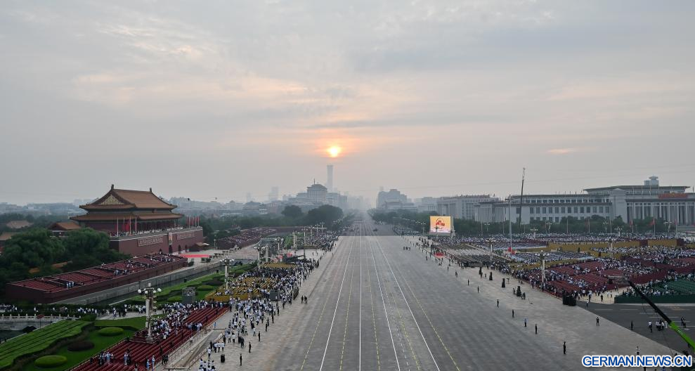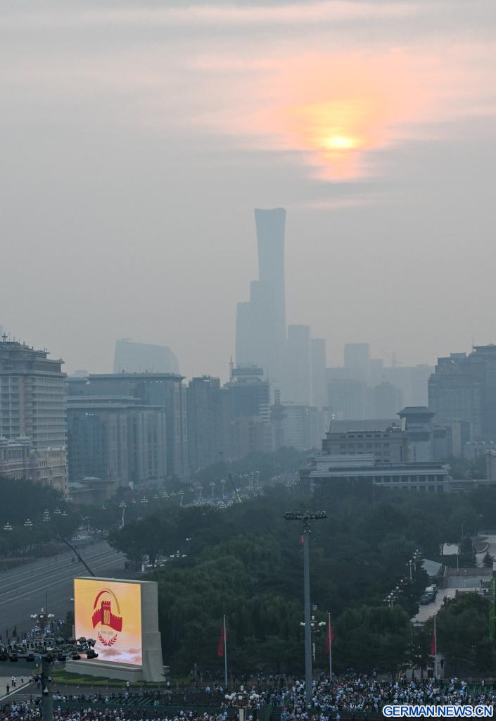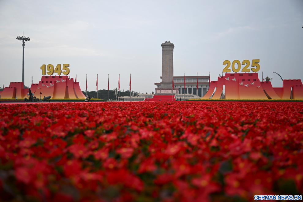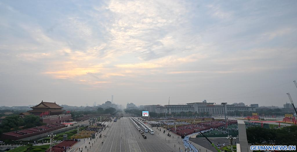 BEIJING, 3. September 2025 (Xinhuanet) -- Das am 3. September 2025 aufgenommene Foto zeigt den Tian'anmen-Platz im Morgengrauen in der chinesischen Hauptstadt Beijing. Eine große Versammlung anlässlich des 80. Jahrestages des Sieges im Widerstandskrieg des chinesischen Volkes gegen die japanische Aggression und im weltweiten antifaschistischen Krieg, die auch eine Militärparade umfasst, findet am 3. September auf dem Tian'anmen-Platz in Beijing statt. (Quelle: Xinhua/Zhang Cheng)