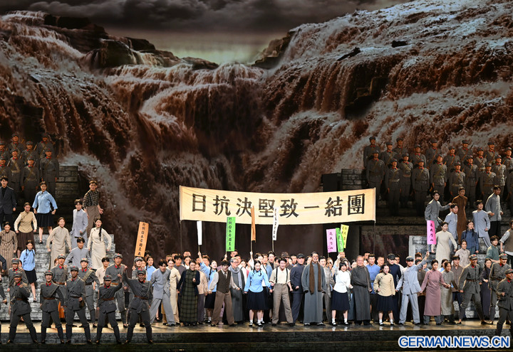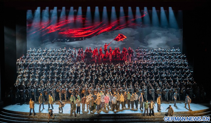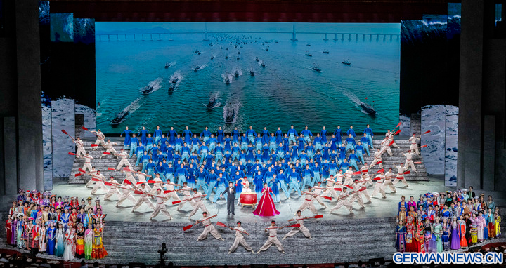 BEIJING, 4. September 2025 (Xinhua) -- Das Foto zeigt eine große Kultur-Gala mit dem Thema „Gerechtigkeit siegt“ zum Gedenken an den 80. Jahrestag des Sieges im Widerstandskrieg des chinesischen Volkes gegen die japanische Aggression und im weltweiten antifaschistischen Krieg in der Großen Halle des Volkes in der chinesischen Hauptstadt Beijing, 3. September 2025. (Xinhua/Yan Yan)