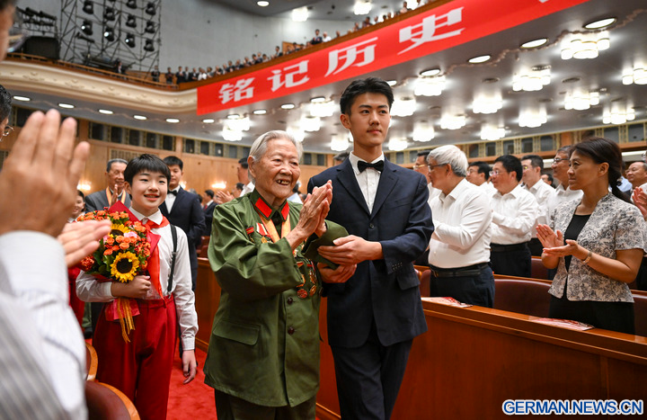BEIJING, 4. September 2025 (Xinhua) -- Kriegsveteranen werden mit herzlichem Applaus vor einer großen Kultur-Gala in der Großen Halle des Volkes in der chinesischen Hauptstadt Beijing empfangen, 3. September 2025. Die große Kultur-Gala mit dem Thema „Gerechtigkeit siegt“ wurde in Beijing zum Gedenken an den 80. Jahrestag des Sieges im Widerstandskrieg des chinesischen Volkes gegen die japanische Aggression und im weltweiten antifaschistischen Krieg veranstaltet. (Xinhua/Yan Yan)