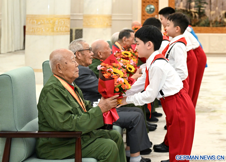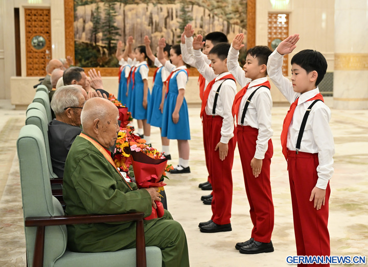 BEIJING, 4. September 2025 (Xinhua) -- Mitglieder der Jungen Pioniere Chinas überreichen Kriegsveteranen Blumen vor einer großen Kultur-Gala in der Großen Halle des Volkes in der chinesischen Hauptstadt Beijing, 3. September 2025. Die große Kultur-Gala mit dem Thema „Gerechtigkeit siegt“ wurde in Beijing zum Gedenken an den 80. Jahrestag des Sieges im Widerstandskrieg des chinesischen Volkes gegen die japanische Aggression und im weltweiten antifaschistischen Krieg veranstaltet. (Xinhua/Li Xiang)
