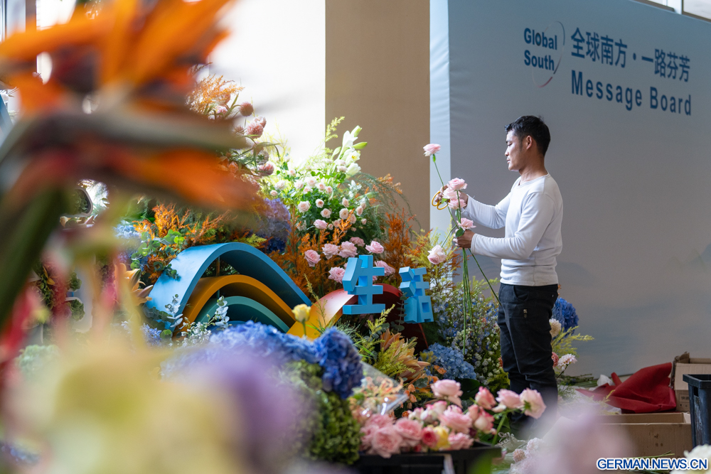 KUNMING, 5. September 2025 (Xinhuanet) -- Ein Mitarbeiter arrangiert die Blumendekoration am Veranstaltungsort des Global South Media and Think Tank Forum 2025 in Kunming in der südwestchinesischen Provinz Yunnan, 5. September 2025. (Quelle: Xinhua/Gao Yongwei)