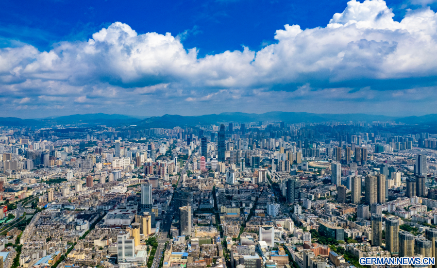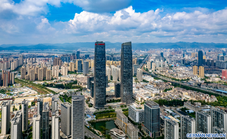 KUNMING, 6. September 2025 (Xinhua) -- Die Luftaufnahme einer Drohne zeigt eine Stadtansicht von Kunming in der südwestchinesischen Provinz Yunnan, 4. September 2025.