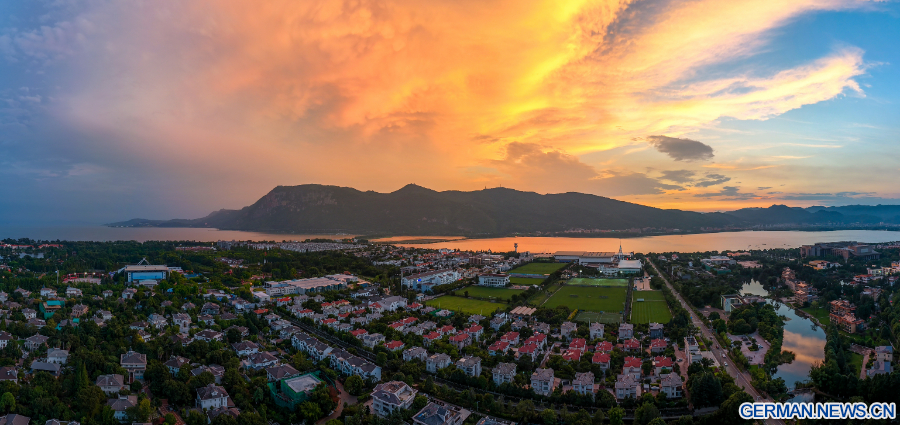 KUNMING, 6. September 2025 (Xinhua) -- Die Luftaufnahme einer Drohne zeigt den Dianchi-See in Kunming in der südwestchinesischen Provinz Yunnan bei Abenddämmerung, 29. Juli 2025.