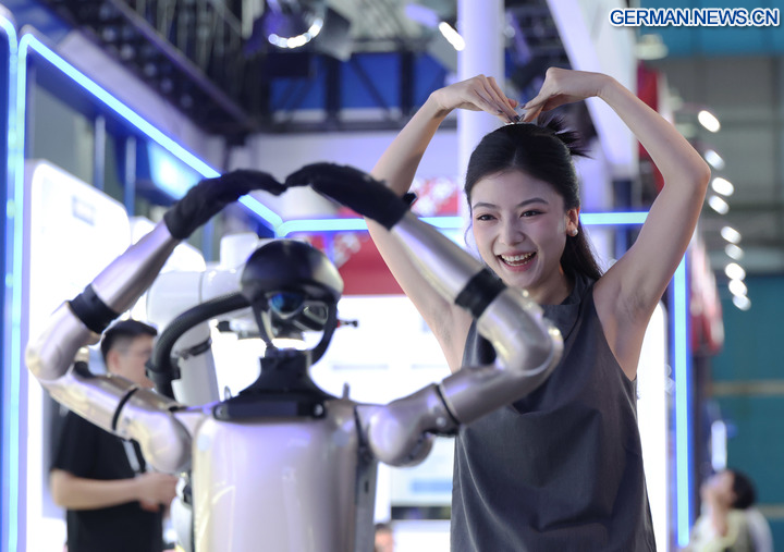 SHENYANG, 7. September 2025 (Xinhua) -- Eine Besucherin interagiert mit einem Roboter im Ausstellungsbereich der Global Industrial Internet Conference 2025 in Shenyang in der nordostchinesischen Provinz Liaoning, 6. September 2025. Unter dem Motto „Digital New Chapter, Intelligent New Quality” begann hier am Samstag die Global Industrial Internet Conference 2025, die bis zum 8. September läuft. (Xinhua/Yang Qing)