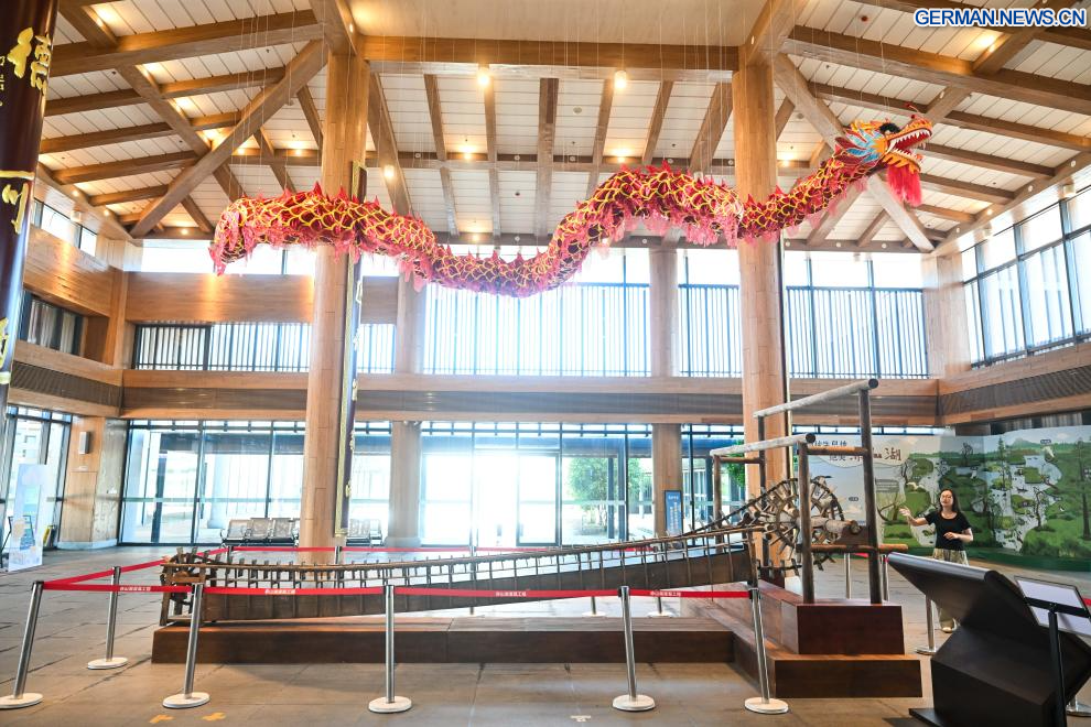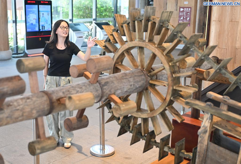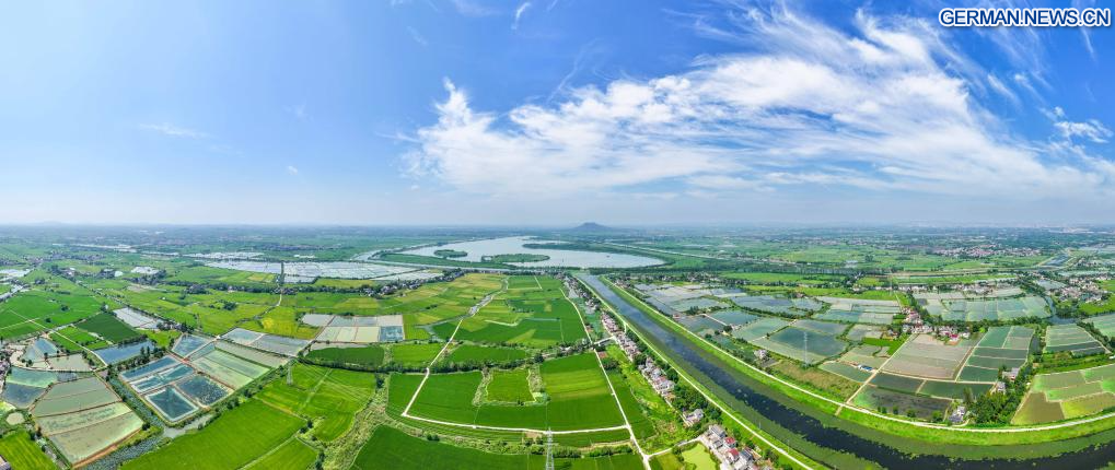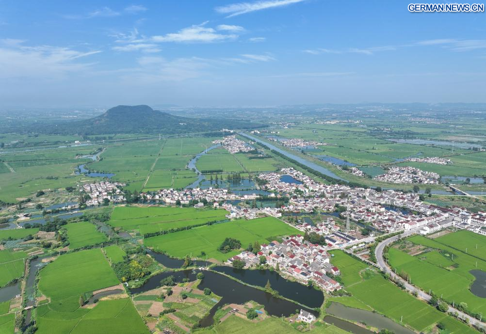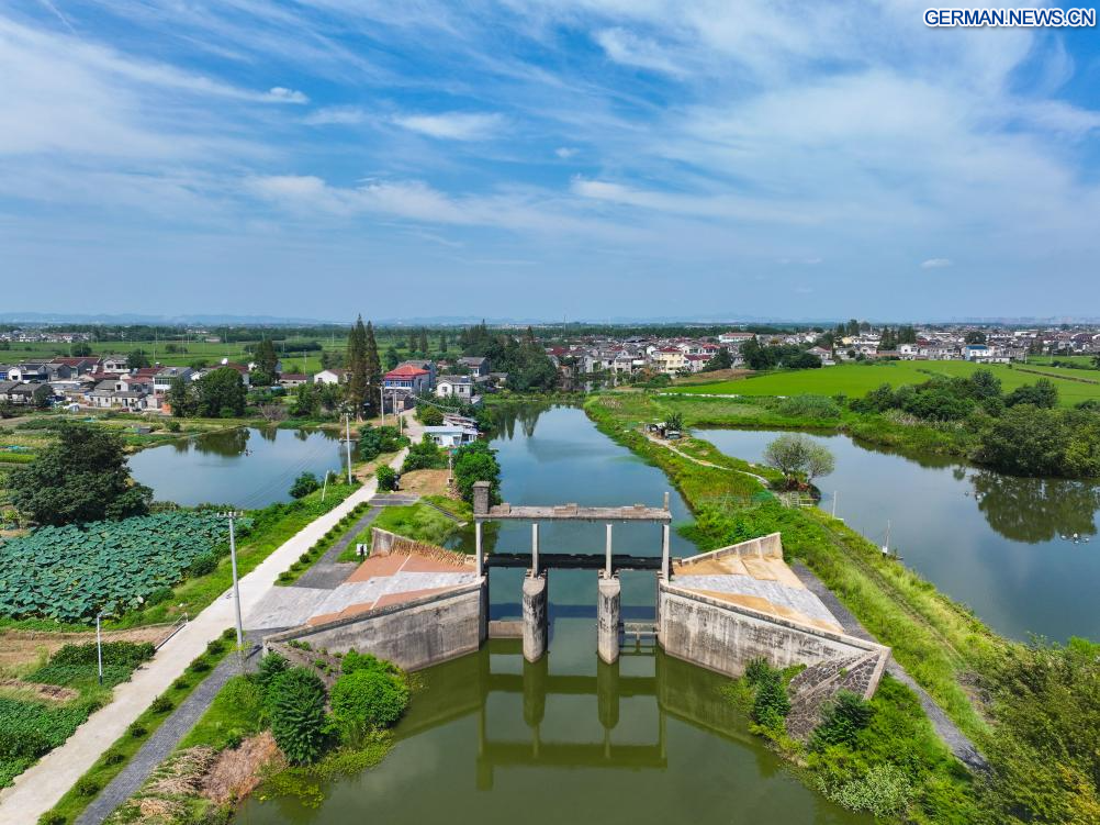 NANJING, 15. September 2025 (Xinhuanet) -- Die Luftaufnahme einer Drohne vom 15. September 2025 zeigt eine vor 1950 erbaute Schleuse in der Stadt Jurong in der ostchinesischen Provinz Jiangsu. Das 17 Jahrhunderte alte Bewässerungssystem des Chishan-Sees wurde kürzlich während der 76. Sitzung des Internationalen Exekutivrats der Internationalen Kommission für Bewässerung und Entwässerung (ICID) in die Liste des Weltkulturerbes für Bewässerungsanlagen (WHIS) aufgenommen. Das System versorgt nach wie vor mehr als 5.100 Hektar Ackerland. (Quelle: Xinhua/Ji Chunpeng)