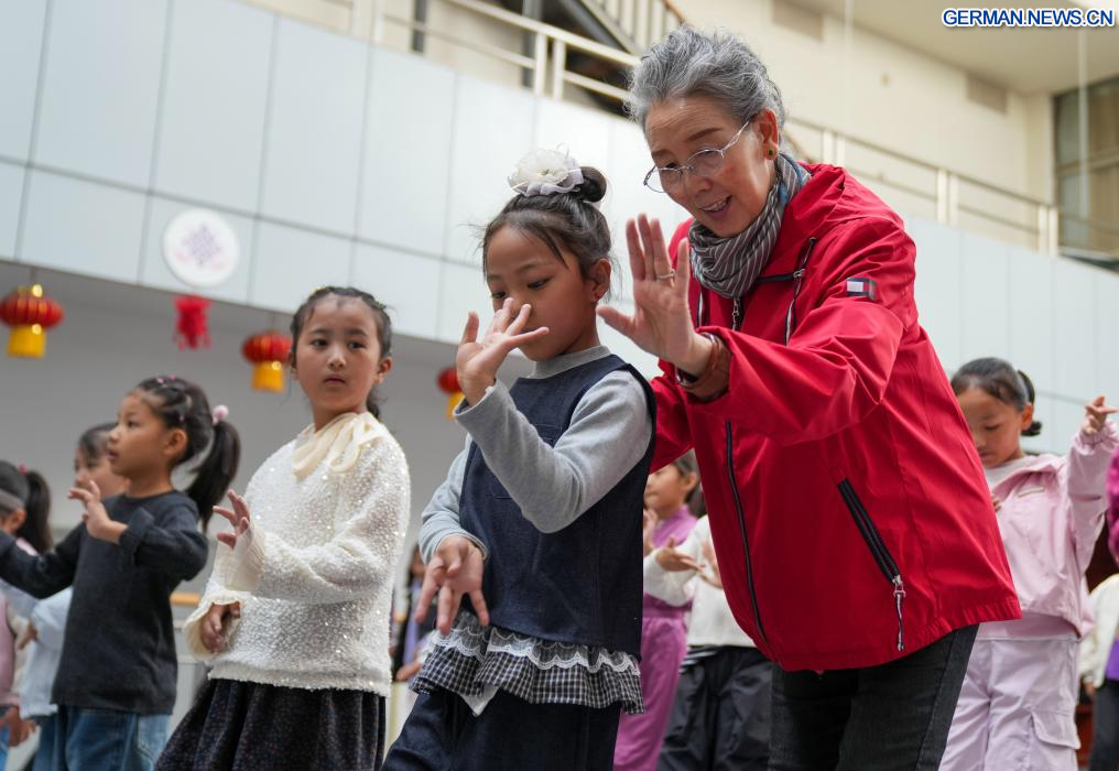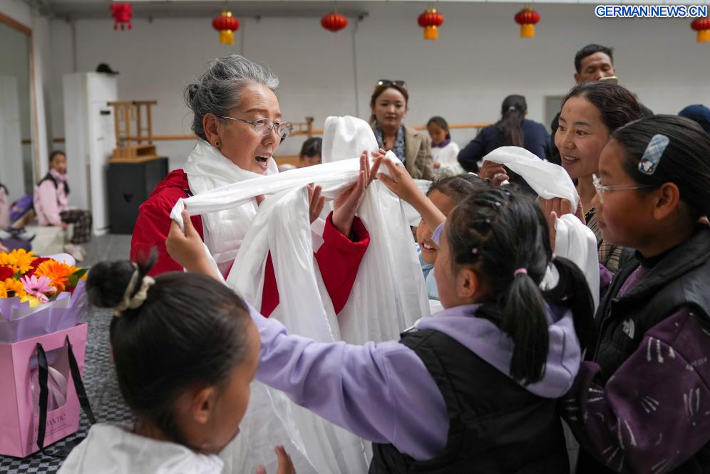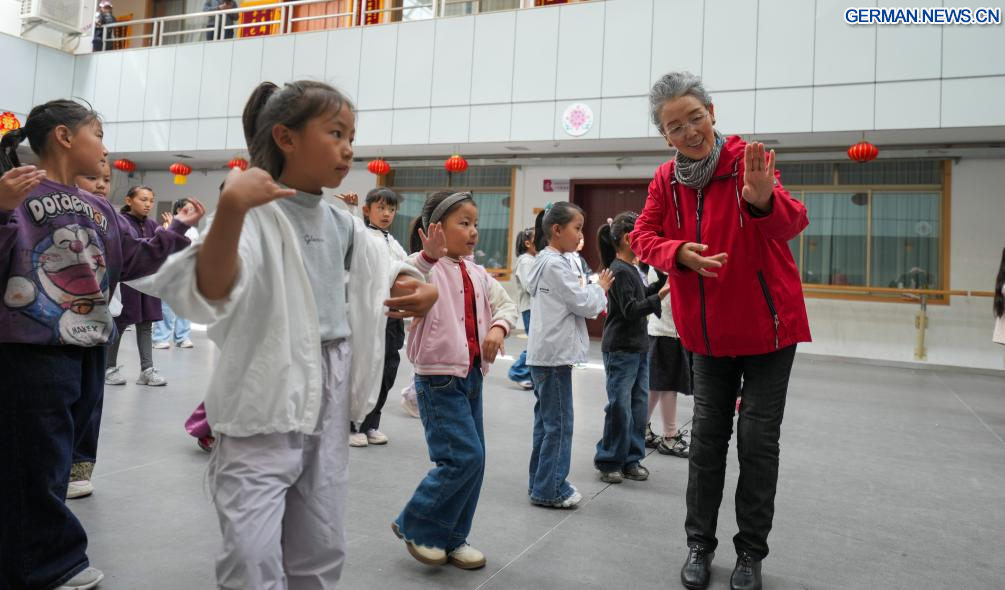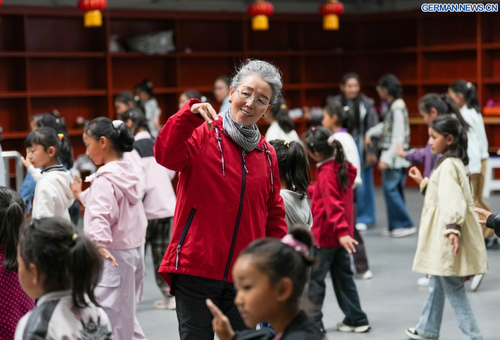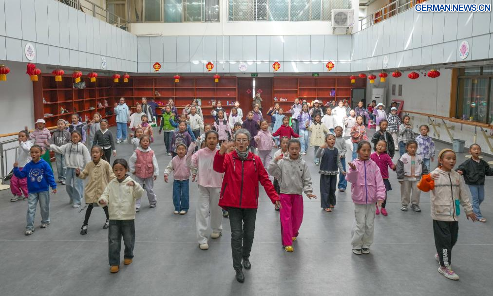 LHASA, 15. September 2025 (Xinhuanet) -- Pasang unterrichtet Kinder in tibetischer Oper im öffentlichen Kunstzentrum in Lhasa im südwestchinesischen Autonomen Gebiet Xizang, 14. September 2025. Pasang, eine nationale Künstlerin erster Klasse und pensioniertes Mitglied der tibetischen Operntruppe des Autonomen Gebiets Xizang, widmet sich seit einem Jahrzehnt freiwillig an ihren Wochenenden der Unterweisung von Kindern in tibetischer Oper.