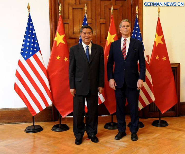 MADRID, 16. September 2025 (Xinhua) -- Der chinesische Vize-Ministerpräsident He Lifeng, der auch Mitglied des Politbüros des Zentralkomitees der Kommunistischen Partei Chinas (KPCh) ist, posiert für ein Foto mit US-Finanzminister Scott Bessent vor ihren Gesprächen im spanischen Madrid, 14. September 2025. Die Delegationen aus China und den USA kamen am Sonntag zu Gesprächen zu Wirtschafts- und Handelsfragen zusammen. (Xinhua/Xing Guangli)