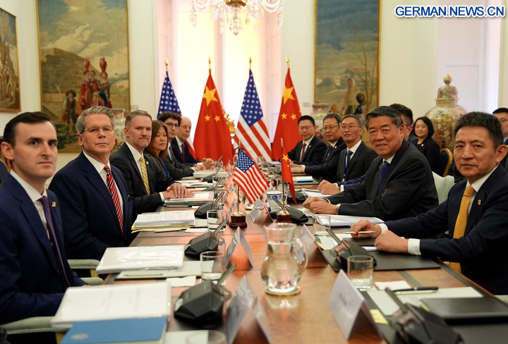 MADRID, 16. September 2025 (Xinhua) -- Die Delegationen aus China und den USA führen Gespräche zu Wirtschafts- und Handelsfragen im spanischen Madrid, 14. September 2025. Die Delegationen aus China und den USA kamen am Montag zum zweiten Tag ihrer Gespräche zu Wirtschafts- und Handelsfragen zusammen. (Xinhua/Xing Guangli)