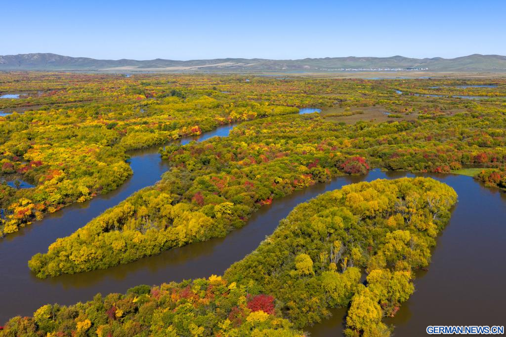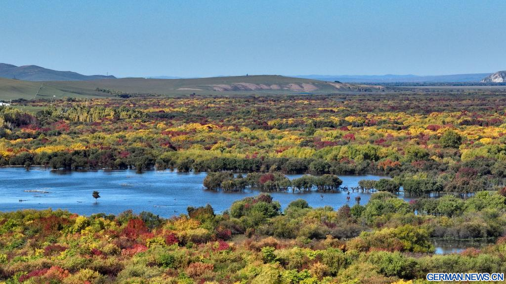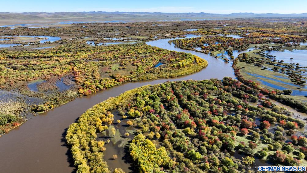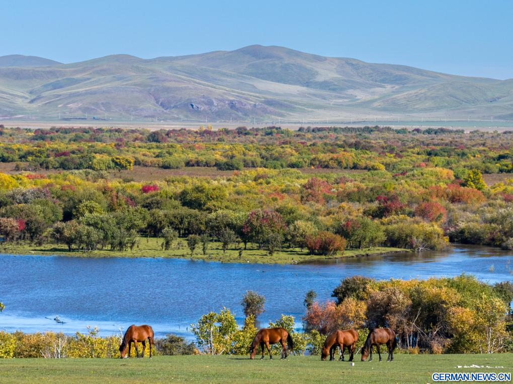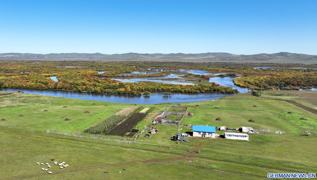 HULUN BUIR, 16. September 2025 (Xinhuanet) -- Das am 15. September 2025 aufgenommene Drohnenfoto zeigt Pferde, die im Feuchtgebiet rund um den Ergune-Fluss in Hulun Buir in der Autonomen Region Innere Mongolei im Norden Chinas weiden. (Quelle: Xinhua/Ma Jinrui)