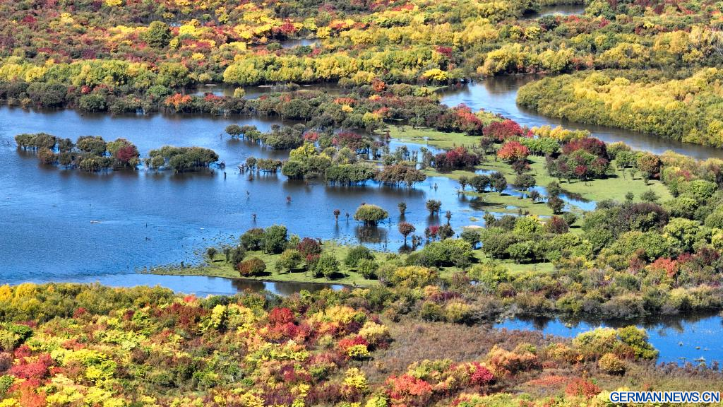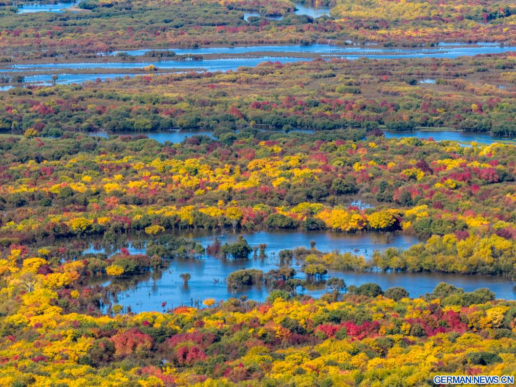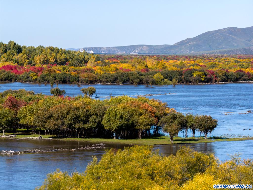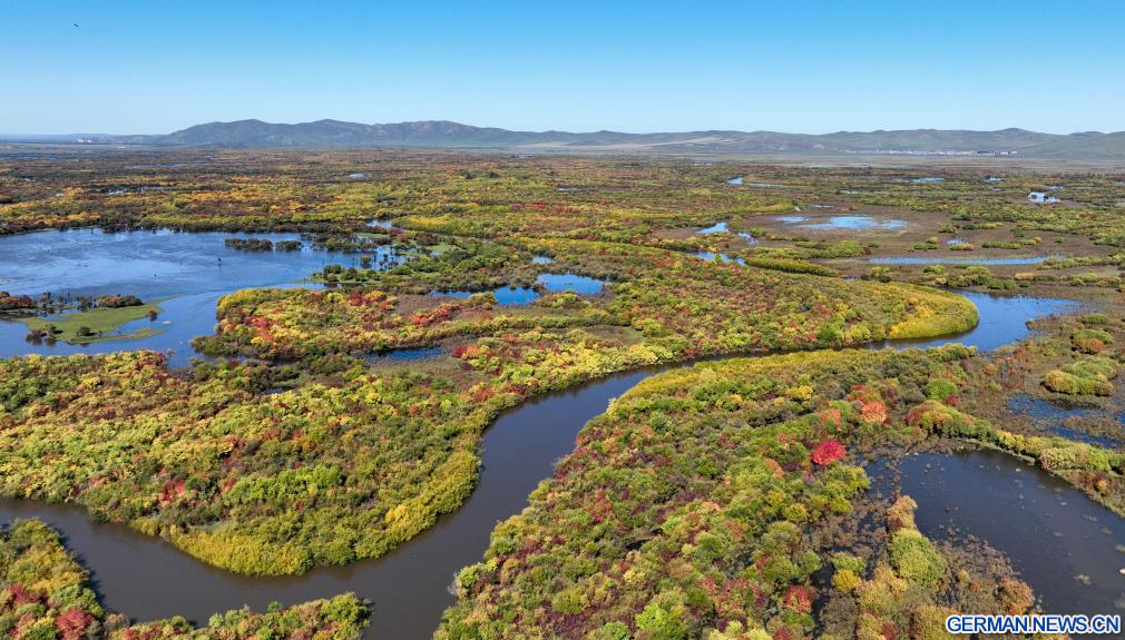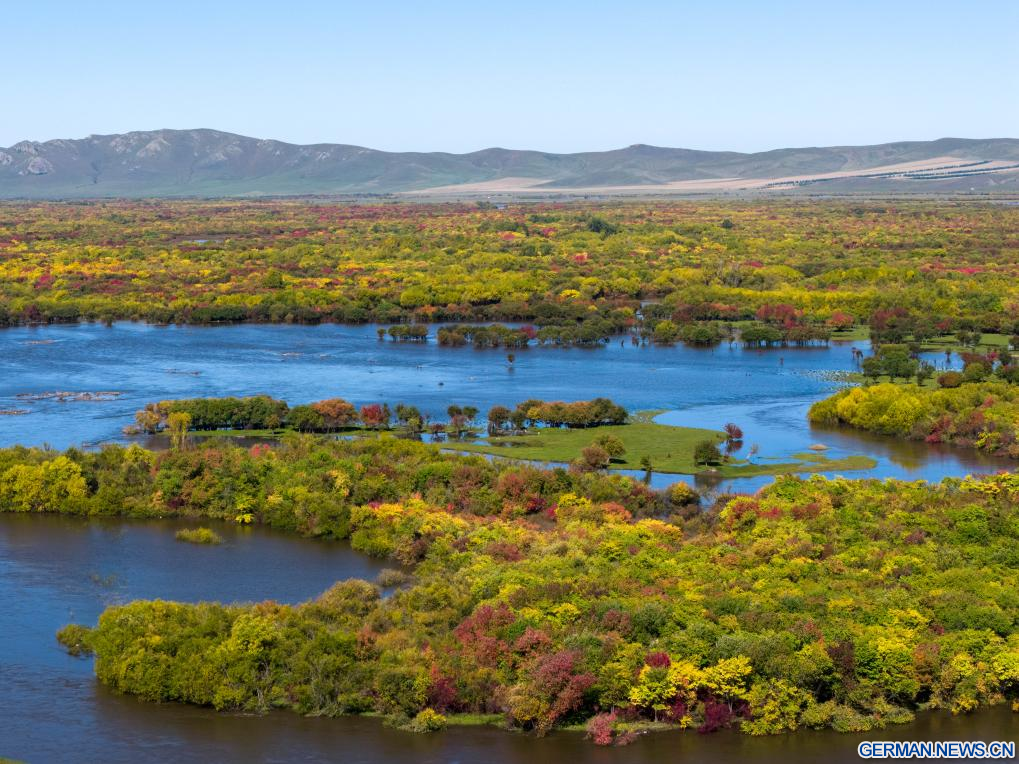 HULUN BUIR, 16. September 2025 (Xinhuanet) -- Das am 15. September 2025 aufgenommene Drohnenfoto zeigt Pferde, die im Feuchtgebiet rund um den Ergune-Fluss in Hulun Buir in der Autonomen Region Innere Mongolei im Norden Chinas weiden. (Quelle: Xinhua/Ma Jinrui)