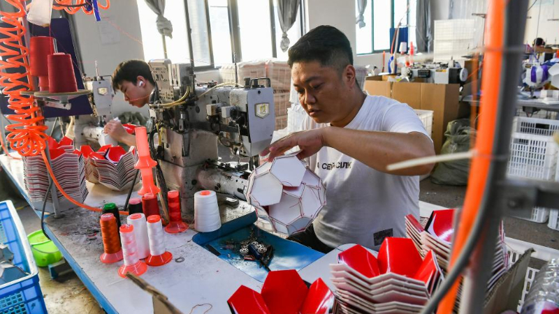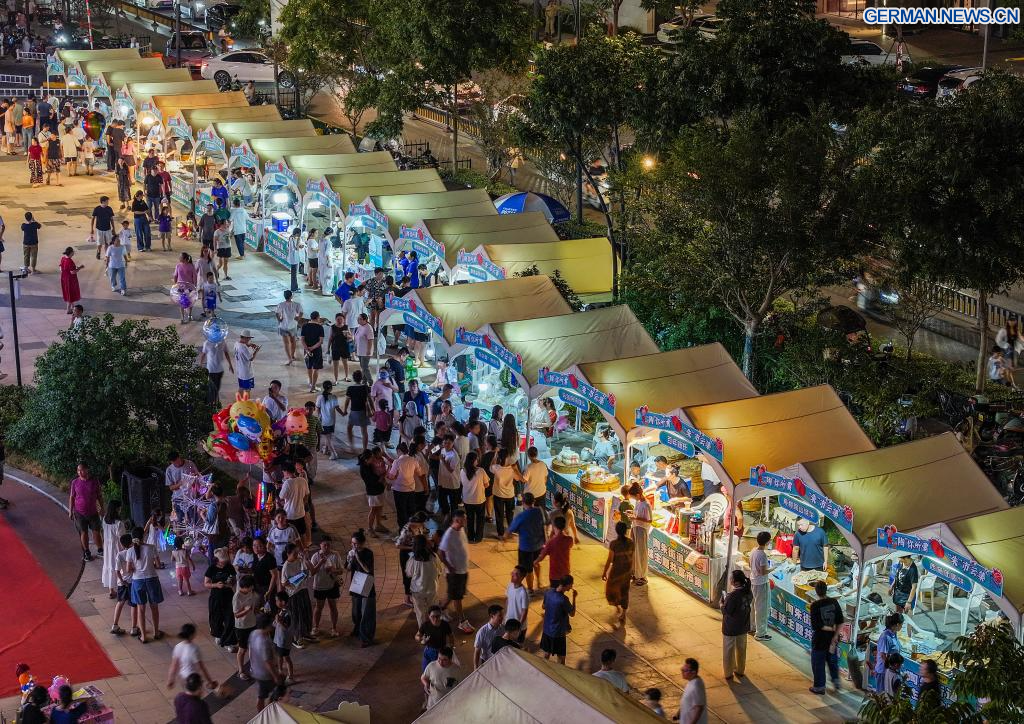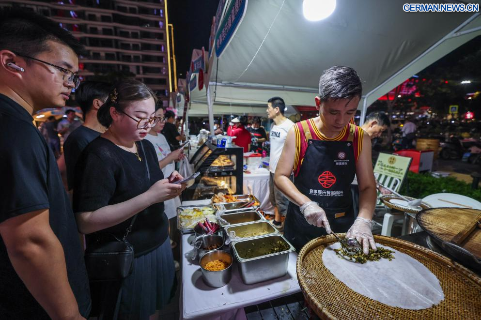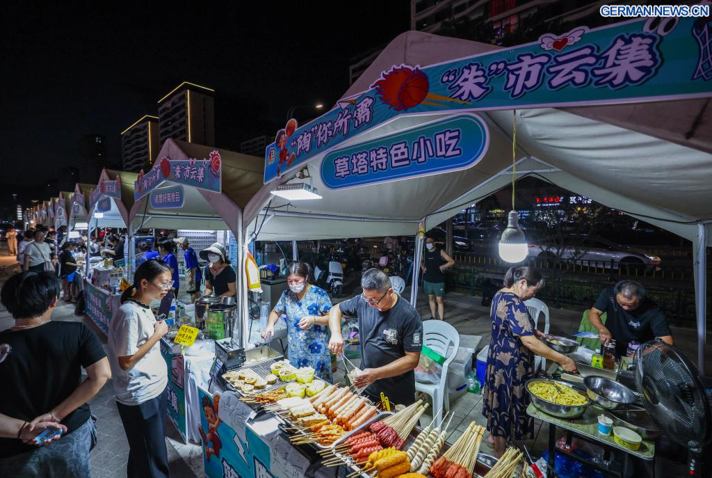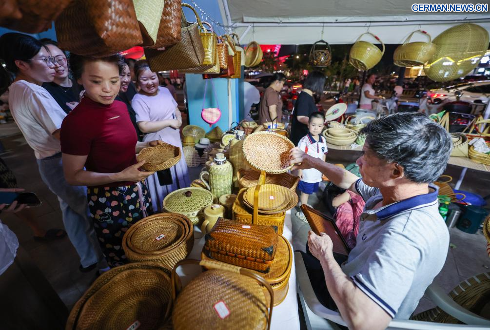 ZHUJI, 16. September 2025 (Xinhuanet) -- Bürger kaufen traditionelle Bambusprodukte auf einem Markt, der neben dem Basketballzentrum der Stadt Zhuji in der Taozhu-Straße in Zhuji in der ostchinesischen Provinz Zhejiang eingerichtet wurde, 16. September 2025. Ein Markt wurde kürzlich neben dem Basketballzentrum der Stadt Zhuji eingerichtet, einem Veranstaltungsort für ZheBA, die provinzweite Community-Basketballliga von Zhejiang. Der Markt dient als Multi-Business-Plattform, die Sport, Einkaufen und Gastronomie miteinander verbindet. (Quelle: Xinhua/Xu Yu)