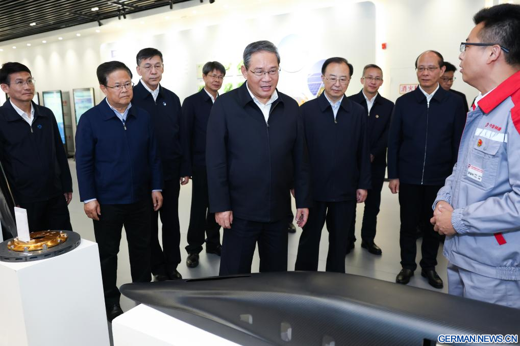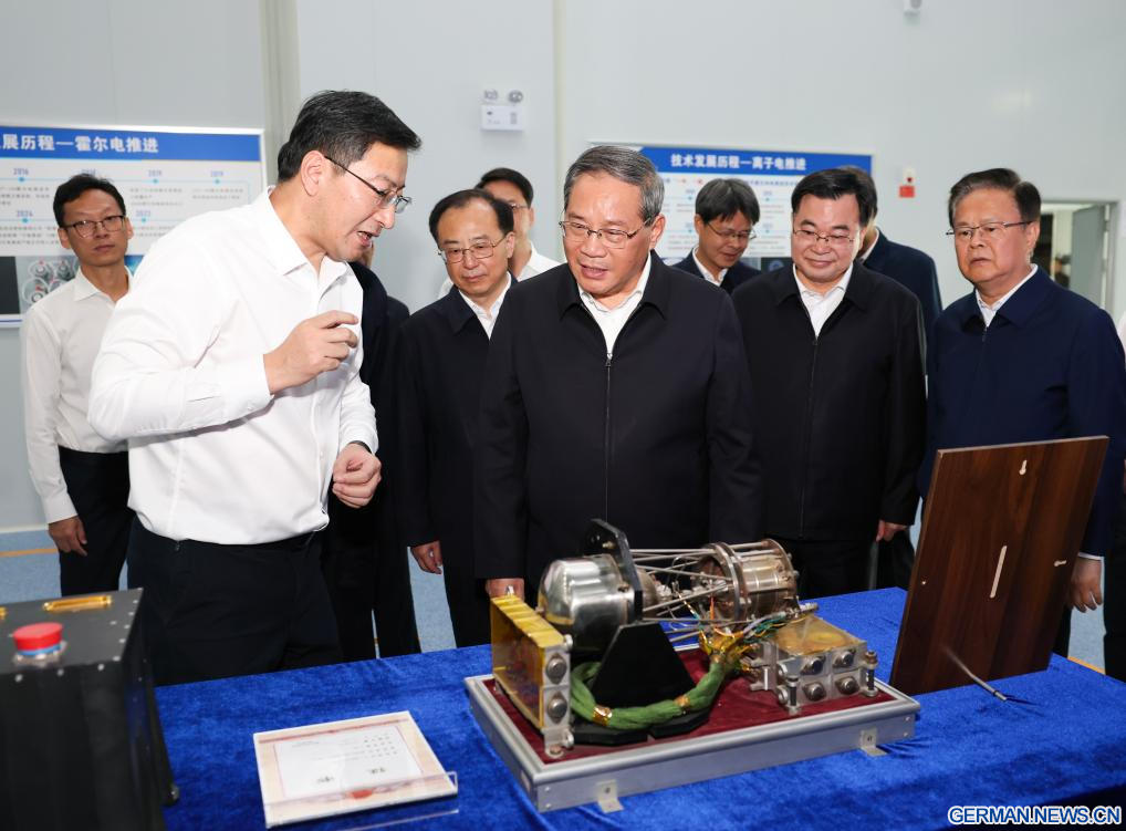 XINING, 16. September 2025 (Xinhuanet) -- Der chinesische Ministerpräsident Li Qiang, ebenfalls Mitglied des Ständigen Ausschusses des Politbüros des Zentralkomitees der Kommunistischen Partei Chinas, besucht ein Hightech-Unternehmen und einen Industriepark in Lanzhou in der nordwestchinesischen Provinz Gansu, 15. September 2025. Li unternahm von Montag bis Dienstag in den nordwestchinesischen Provinzen Gansu und Qinghai eine Inspektionstour. (Quelle: Xinhua/Huang Jingwen)