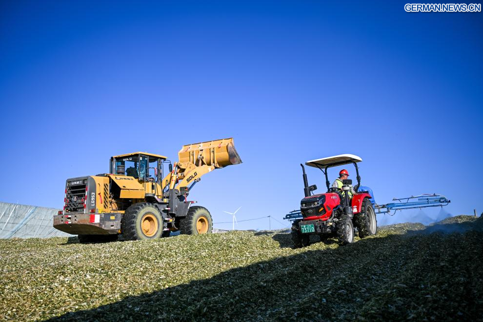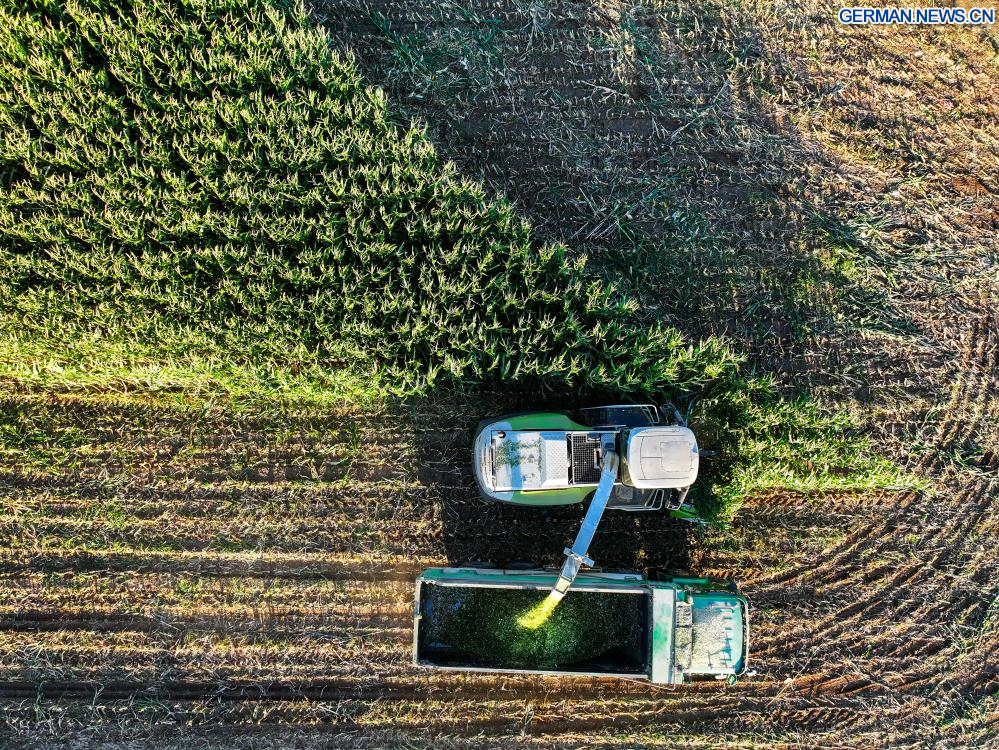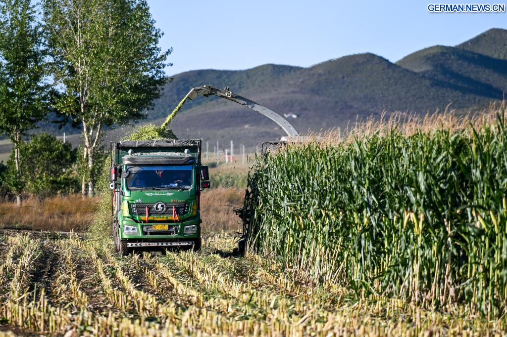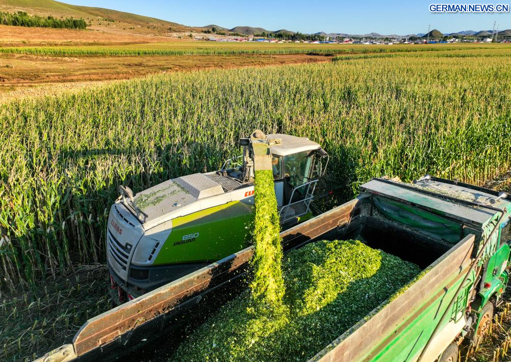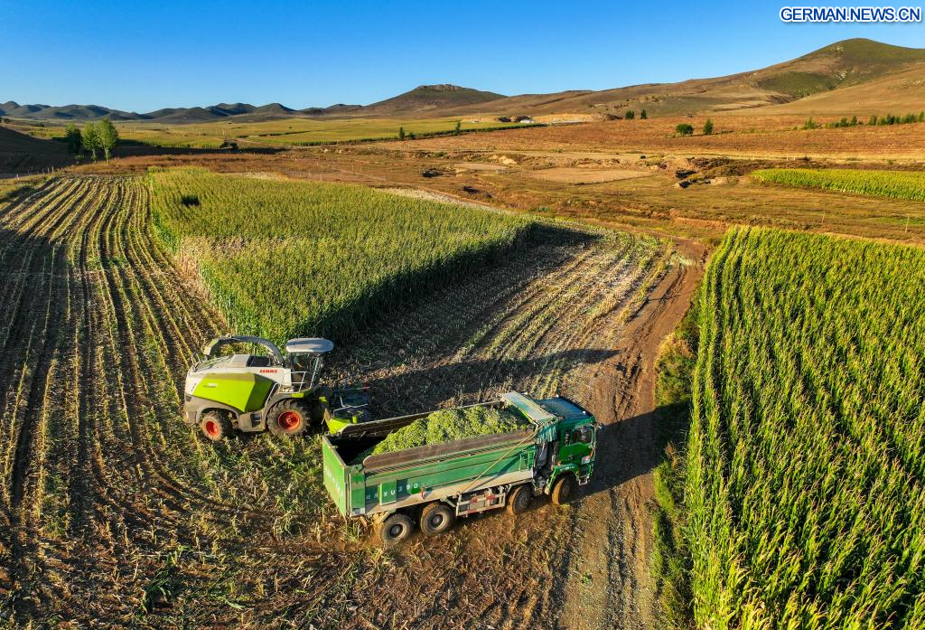 TONGLIAO, 18. September 2025 (Xinhuanet) -- Das am 18. September 2025 aufgenomme Foto zeigt eine Erntemaschine bei der Arbeit auf einem Maisfeld in der Gemeinde Jurihe von Jarud Banner in der Stadt Tongliao in der Autonomen Region Innere Mongolei in Nordchina. (Quelle: Xinhua/Lian Zhen)