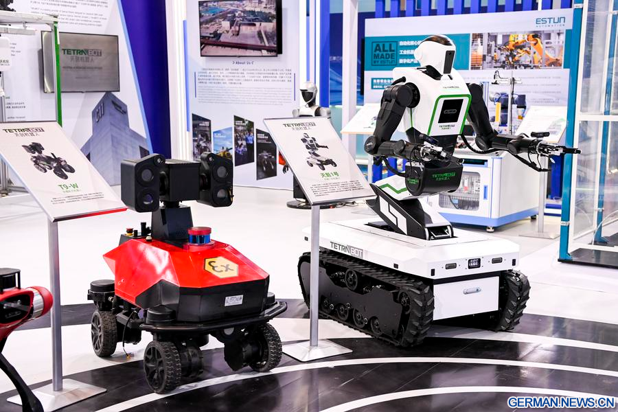 Das Foto zeigt KI-gestützte Feuerlöschgeräte im Internationalen Kongress- und Ausstellungszentrum in Nanning, der Hauptstadt des Autonomen Gebiets Guangxi der Zhuang-Nationalität in Südchina, 17. September 2025. (Xinhua/Cao Yiming)