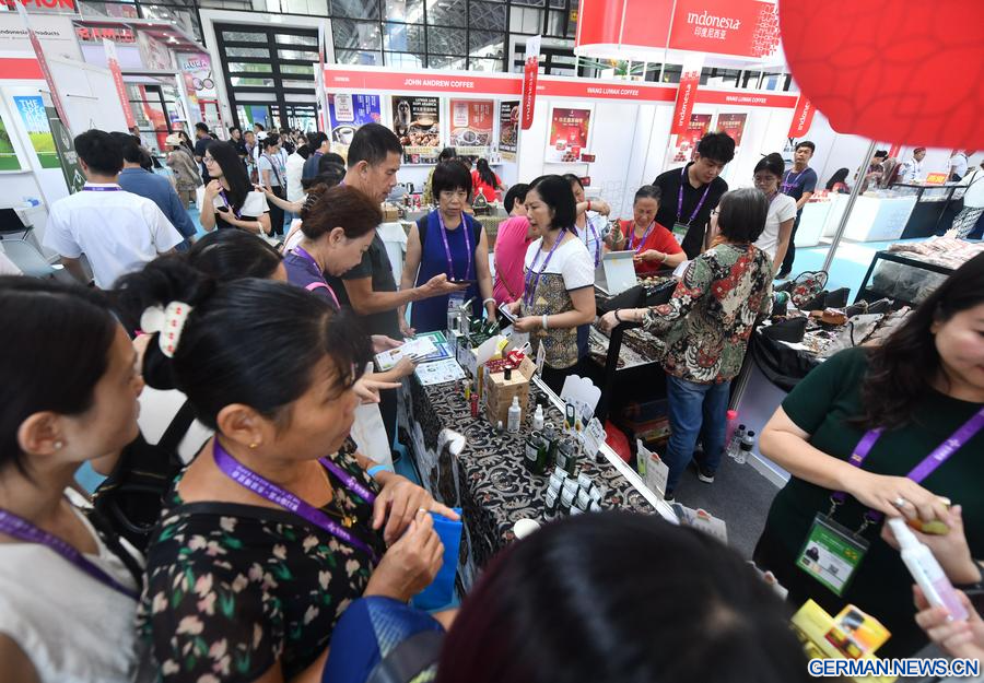 Messebesucher kaufen Waren aus Indonesien während der 22. China-ASEAN-Expo im Internationalen Kongress- und Ausstellungszentrum in Nanning, der Hauptstadt des Autonomen Gebiets Guangxi der Zhuang-Nationalität in Südchina, 17. September 2025. (Xinhua/Huang Xiaobang)