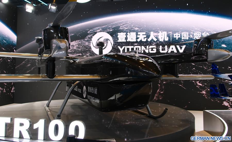 Das Foto zeigt ein ausgestelltes unbemanntes Luftfahrzeug im Internationalen Kongress- und Ausstellungszentrum in Nanning, der Hauptstadt des Autonomen Gebiets Guangxi der Zhuang-Nationalität in Südchina, 17. September 2025. (Xinhua/Hu Qiusi)