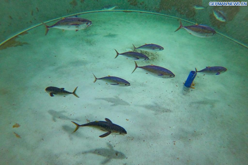Dank technologischer Durchbrüche hat das Fischereiforschungsinstitut der Chinesischen Akademie für Fischereiwissenschaften im Südchinesischen Meer in Lingshui eine Offshore-Zuchtstation für Gelbflossenthunfische eingerichtet, in der es gelungen ist, Gelbflossenthunfische künstlich laichen zu lassen und deren Eier auszubrüten. (Quelle: Xinhua/Guo Cheng)