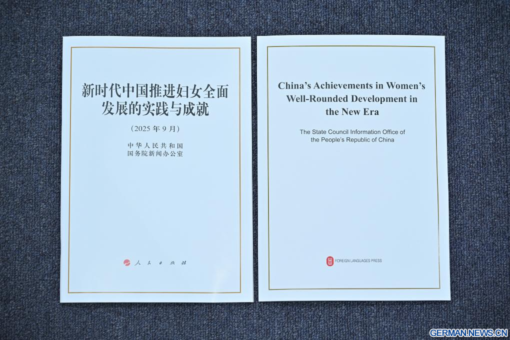 BEIJING, 19. September 2025 (Xinhuanet) -- Dieses Foto zeigt Exemplare des Weißbuchs mit dem Titel „Chinas Erfolge bei der umfassenden Entwicklung von Frauen im neuen Zeitalter“, das vom Informationsbüro des Staatsrats (SCIO) während einer Pressekonferenz in Chinas Hauptstadt Beijing veröffentlicht wurde, 19. September 2025. (Quelle: Xinhua/Li Xin)
