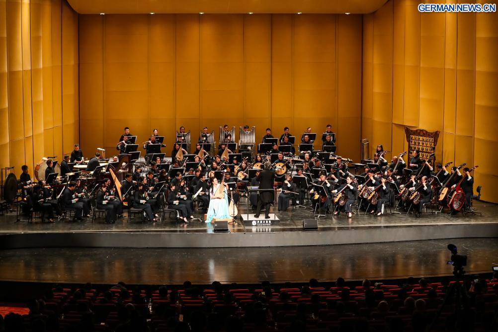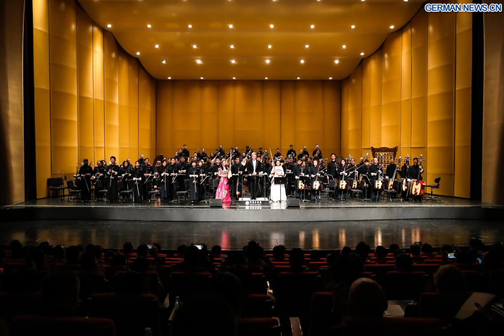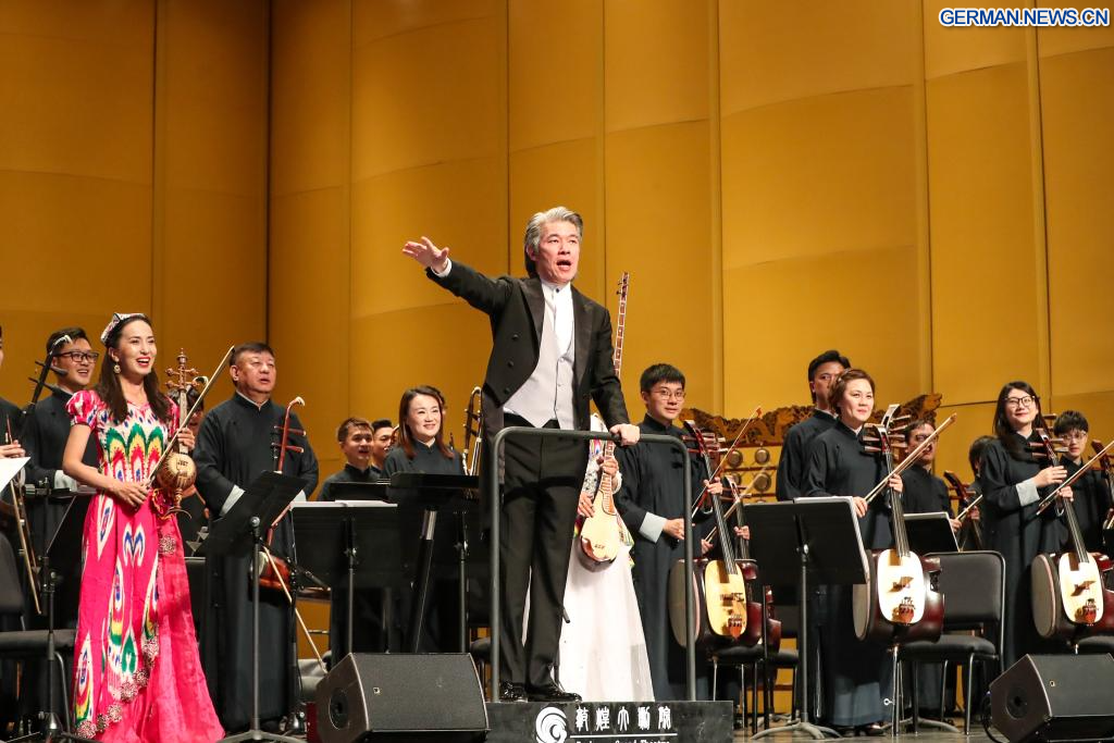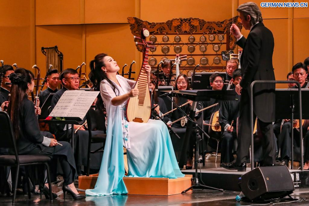 DUNHUANG, 22. September 2025 (Xinhuanet) -- Musiker treten bei einem Konzert im Rahmen der 8. Internationalen Kultur-Expo der Seidenstraße (Dunhuang) im Dunhuang Grand Theatre in Dunhuang in der nordwestchinesischen Provinz Gansu auf, 21. September 2025 auf. (Quelle: Xinhua/Lang Bingbing)
