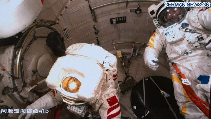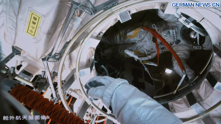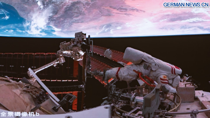 BEIJING, 26. September 2025 (Xinhua) -- Das im Raumfahrtkontrollzentrum Beijing (BACC) aufgenommene Bild zeigt den „Shenzhou-20“-Astronauten Wang Jie bei einem Außenbordeinsatz außerhalb der chinesischen Raumstation in der Umlaufbahn, 25. September 2025. Die „Shenzhou-20“-Besatzung an Bord der chinesischen Raumstation hat laut der Behörde für bemannte Raumfahrt in China (CMSA) am Freitag den vierten Außenbordeinsatz abgeschlossen. (Xinhua/Li Minggang)