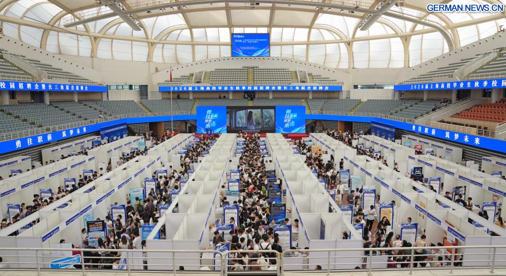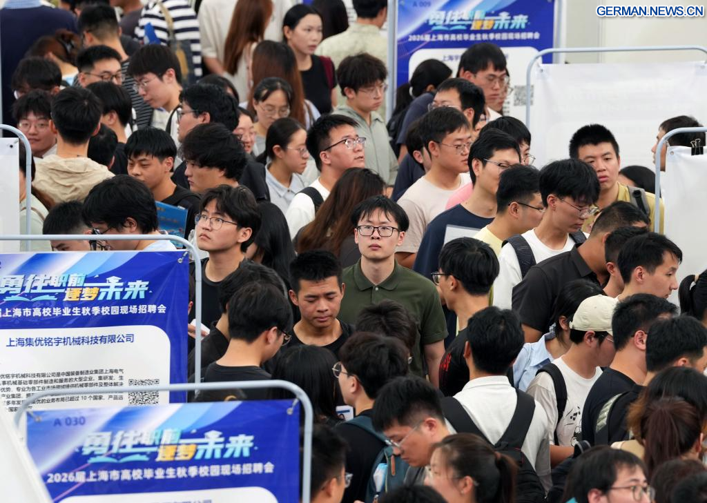 SHANGHAI, 26. September 2025 (Xinhuanet) -- Das am 26. September 2025 aufgenommene Foto zeigt eine Szene auf einer Herbst-Jobmesse für Hochschulabsolventen in Shanghai auf dem Minhang-Campus der Shanghai Jiao Tong University im ostchinesischen Shanghai. Die Jobmesse begann hier am Freitag mit mehr als 1.000 teilnehmenden Arbeitgebern und bot rund 35.000 Stellen an. (Quelle: Xinhua/Liu Ying)
