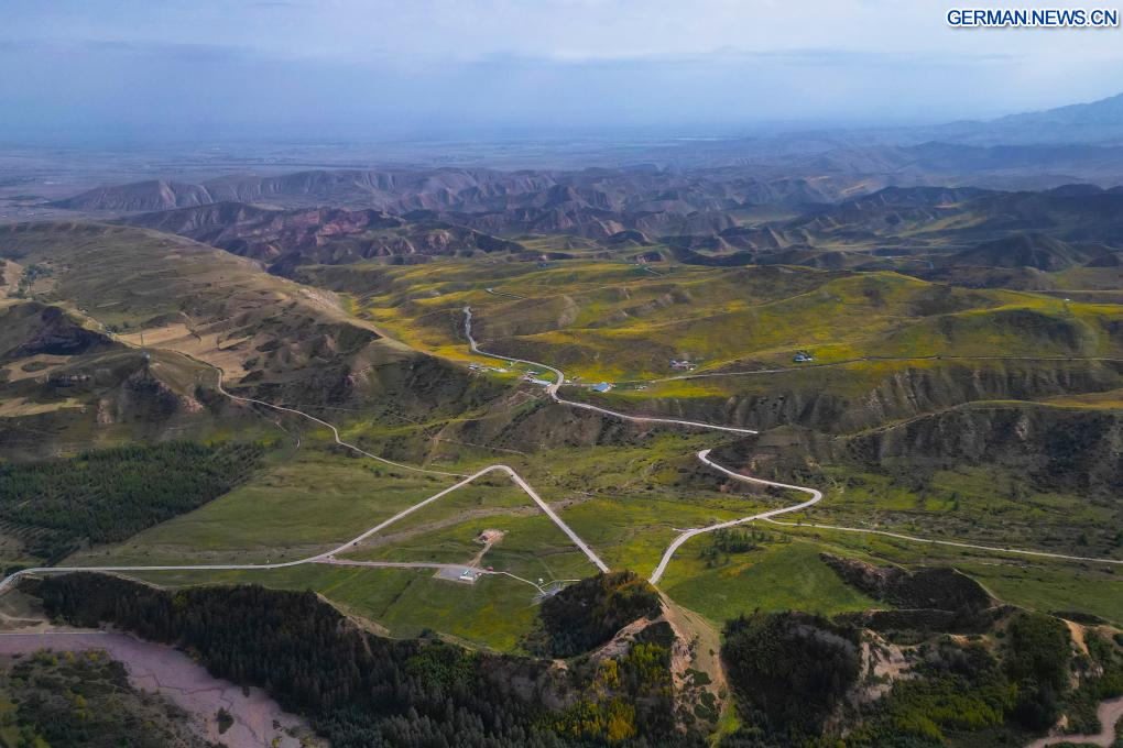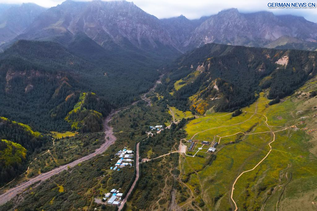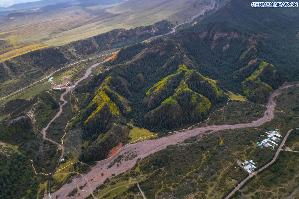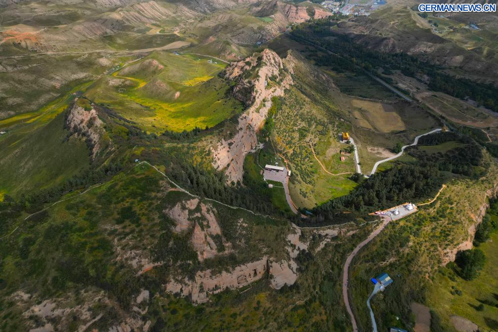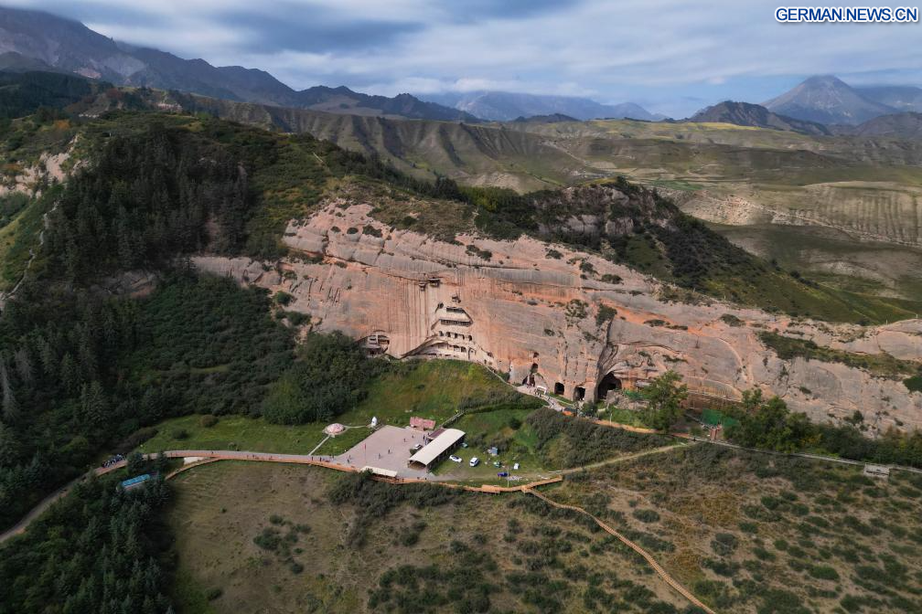 ZHANGYE, 26. September 2025 (Xinhuanet) -- Die Luftaufnahme einer Drohne vom 26. September 2025 zeigt einen Blick auf die Mati-Tempelhöhlen in der Stadt Zhangye in der nordwestchinesischen Provinz Gansu. Die Mati-Tempelhöhlen wurden vor etwa 1.600 Jahren entlang der antiken Seidenstraße erbaut und sind berühmt für ihre buddhistischen Relikte, die in mehr als 70 Höhlen aufbewahrt werden, darunter mehr als 500 farbige Skulpturen sowie Wandmalereien mit einer Gesamtfläche von über 1.200 Quadratmetern. (Quelle: Xinhua/Zhang Zhimin)