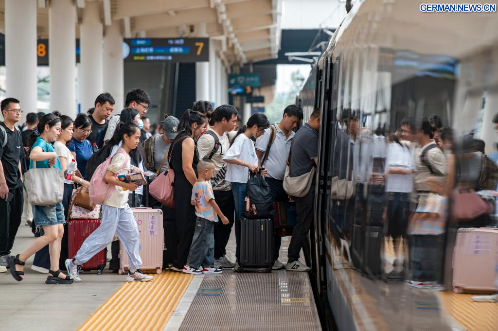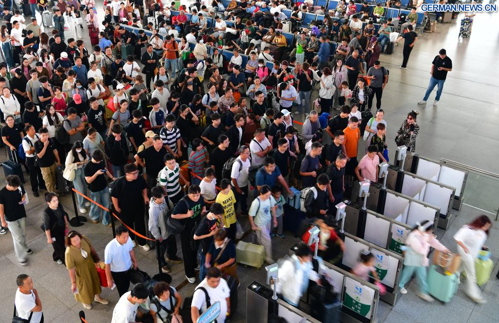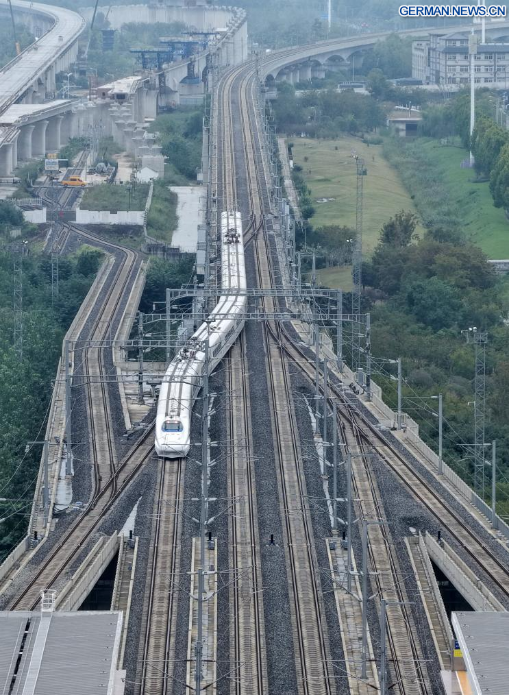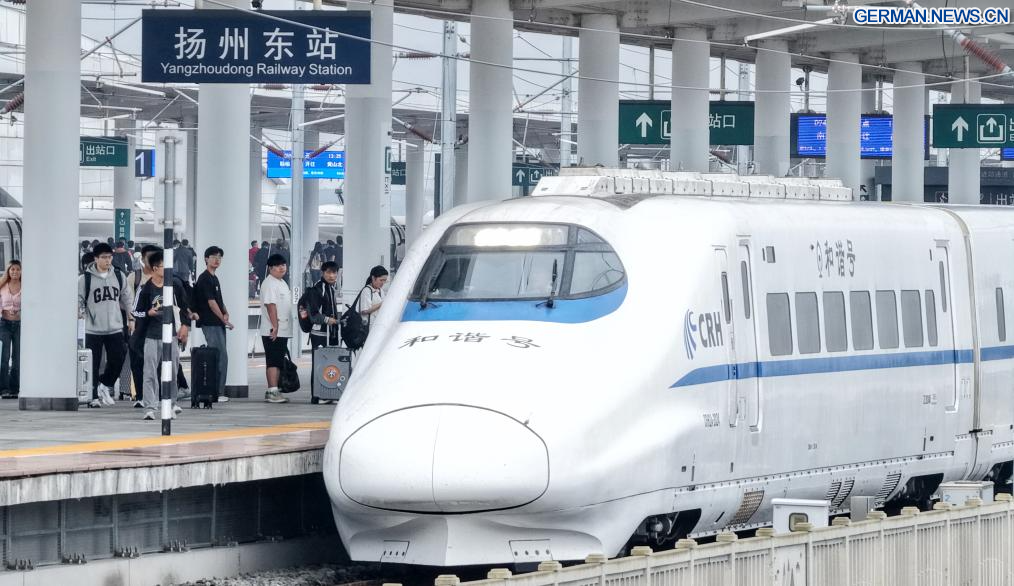 BEIJING, 29. September 2025 (Xinhuanet) -- Die Luftaufnahme einer Drohne vom 29. September 2025 zeigt einen Zug, der aus dem Ostbahnhof von Yangzhou in der Stadt Yangzhou in der ostchinesischen Provinz Jiangsu abfährt. Der Reiseansturm zum chinesischen Nationalfeiertag begann am 29. September und dauert bis zum 10. Oktober. (Foto von Meng Delong/Xinhua)