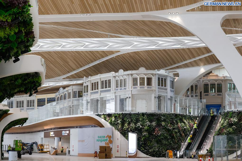 GUANGZHOU, 29. September 2025 (Xinhuanet) -- Ein Geschäftsbereich des Terminals T3 des Internationalen Flughafens Guangzhou-Baiyun im lokalen Architekturstil Qilou, einem charakteristischen lokalen Baustil, ist in Guangzhou in der südchinesischen Provinz Guangdong zu sehen, 29. September 2025. Der Bau des Terminals T3 des Internationalen Flughafens Guangzhou-Baiyun wurde kürzlich weitgehend abgeschlossen. Das Terminal soll bis Ende 2025 in Betrieb genommen werden.