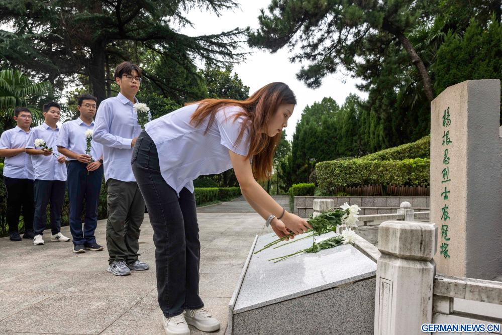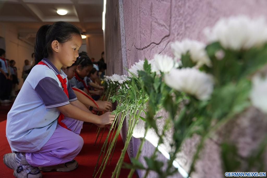 BEIJING, 30. September 2025 (Xinhuanet) -- Schüler legen Blumen für Märtyrer in einem Gedenkmuseum in Nanchang in der ostchinesischen Provinz Jiangxi nieder, 30. September 2025. China beging am Dienstag seinen 12. Märtyrertag mit landesweiten Gedenkveranstaltungen zu Ehren gefallener Nationalhelden. (Quelle: Xinhua/Wan Xiang)