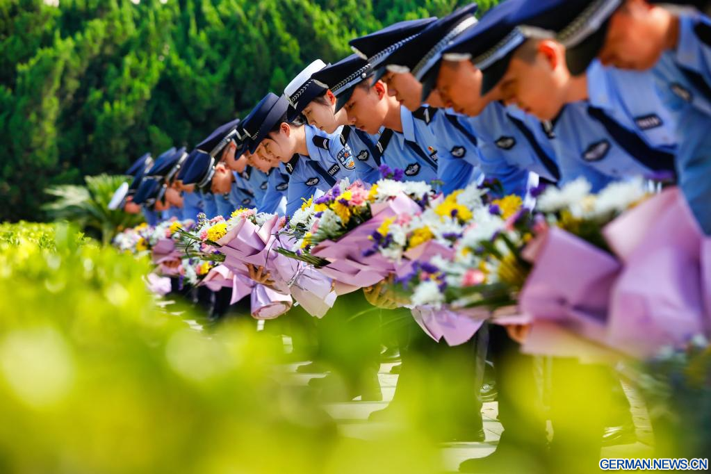 BEIJING, 30. September 2025 (Xinhuanet) -- Polizeibeamte legen Blumen für Märtyrer auf einem Friedhof in Nordchinas Tianjin nieder, 30. September 2025. China beging am Dienstag seinen 12. Märtyrertag mit landesweiten Gedenkveranstaltungen zu Ehren gefallener Nationalhelden. (Foto von Du Penghui/Xinhua)