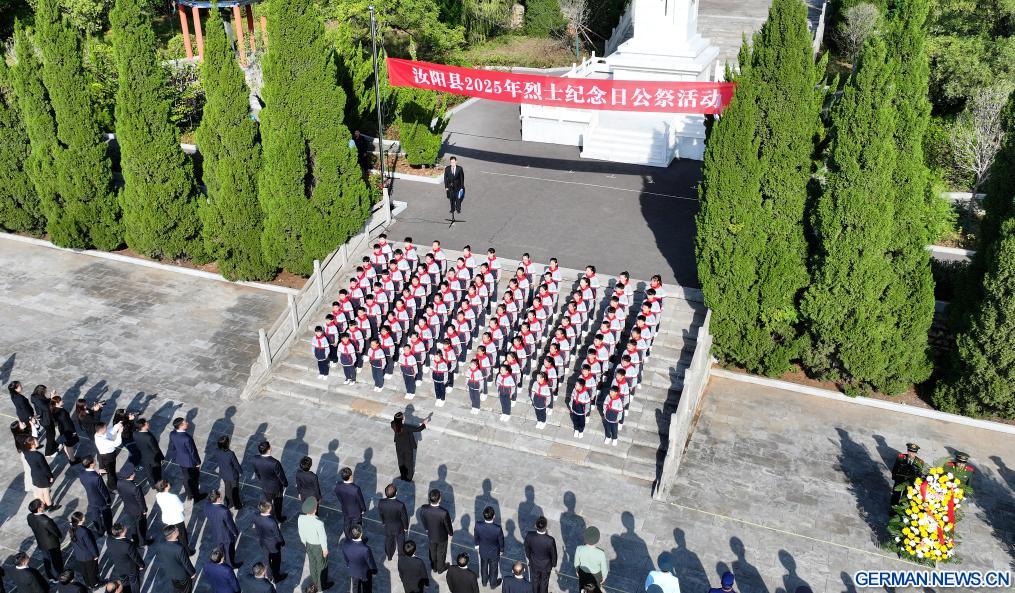 BEIJING, 30. September 2025 (Xinhuanet) -- Die Luftaufnahme einer Drohne vom 30. September 2025 zeigt Schüler, die an einer Gedenkveranstaltung auf einem Märtyrerfriedhof im Kreis Ruyang in der zentralchinesischen Provinz Henan teilnehmen. China beging am Dienstag seinen 12. Märtyrertag mit landesweiten Gedenkveranstaltungen zu Ehren gefallener Nationalhelden. (Foto von Kang Hongjun/Xinhua)