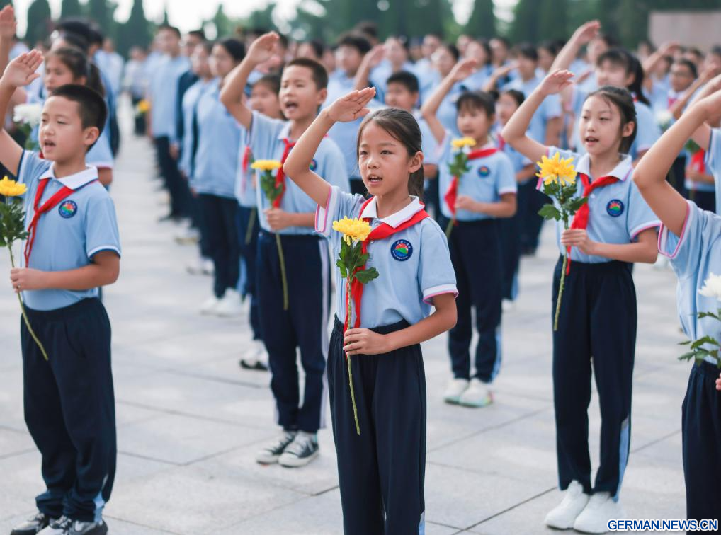 BEIJING, 30. September 2025 (Xinhuanet) -- Kinder nehmen an einer Gedenkveranstaltung auf einem Märtyrerfriedhof in Rongcheng in der ostchinesischen Provinz Shandong teil, 30. September 2025. China beging am Dienstag seinen 12. Märtyrertag mit landesweiten Gedenkveranstaltungen zu Ehren gefallener Nationalhelden. (Foto von Li Xinjun/Xinhua)