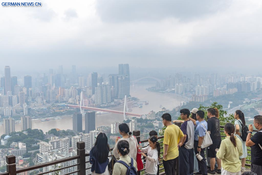CHONGQING, 4. Oktober 2025 (Xinhuanet) -- Touristen genießen den Blick auf die Stadt in einem Landschaftsgebiet in der südwestchinesischen regierungsunmittelbaren Stadt Chongqing, 2. Oktober 2025. (Quelle: Xinhua/Huang Wei)