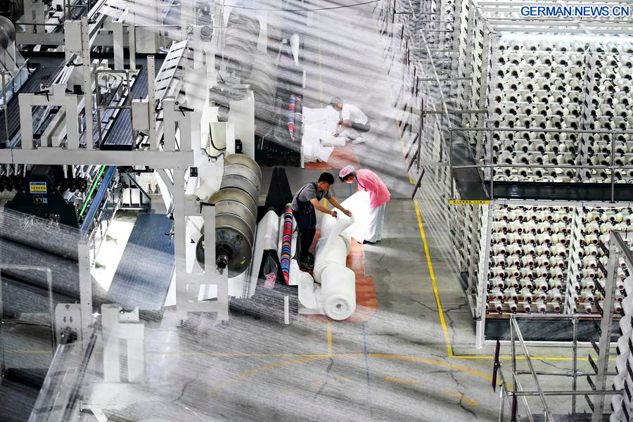 Das Foto zeigt eine Szene aus der intelligenten Werkshalle von SinceTech, einem Unternehmen für Schuhmaterialien und Textilien, in Jinjiang in der Provinz Fujian im Südosten Chinas, 20. August 2025. (Xinhua/Lin Shanchuan)