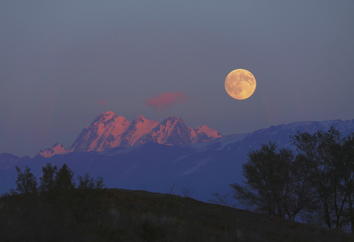 BEIJING, 7. Oktober 2025 (Xinhua) -- Das Foto zeigt den Vollmond im Hintergrund in Urumqi im Uigurischen Autonomen Gebiet Xinjiang im Nordwesten Chinas, 6. Oktober 2025. Am Montag wurde das diesjährige Mondfest gefeiert, das jedes Jahr am 15. Tag des achten Monats des chinesischen Mondkalenders begangen wird. Menschen in ganz China bewundern den Vollmond, um den traditionellen Feiertag zu feiern. (Xinhua/Xu Hongyan)