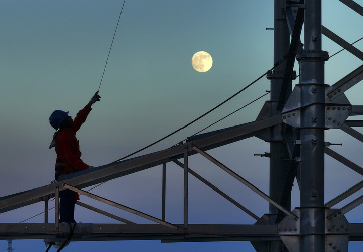 BEIJING, 7. Oktober 2025 (Xinhua) -- Die Drohnenaufnahme zeigt einen Arbeiter mit dem Vollmond im Hintergrund in Hengyang in der Provinz Hunan in Zentralchina, 6. Oktober 2025. Am Montag wurde das diesjährige Mondfest gefeiert, das jedes Jahr am 15. Tag des achten Monats des chinesischen Mondkalenders begangen wird. Menschen in ganz China bewundern den Vollmond, um den traditionellen Feiertag zu feiern. (Foto von Cao Zhengping/Xinhua)