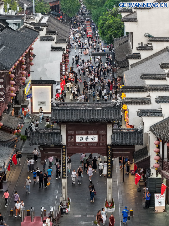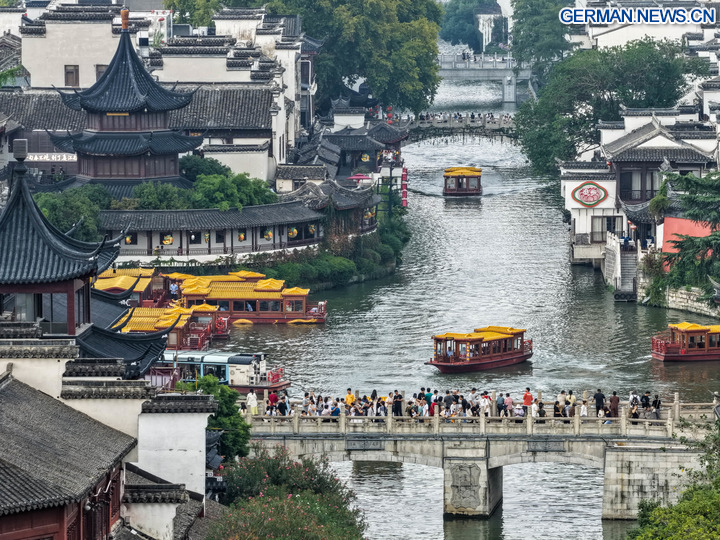 BEIJING, 8. Oktober 2025 (Xinhua) -- Die Drohnenaufnahme zeigt Touristen beim Besuch des sehenswerten Fuzi-Tempels (Konfuzius-Tempel) in Nanjing in der Provinz Jiangsu in Ostchina, 7. Oktober 2025. Auch zum Ende der Ferienzeit zum Nationalfeiertag und zum Mondfest ist die Begeisterung der Touristen im ganzen Land ungebrochen. (Xinhua/Li Bo)