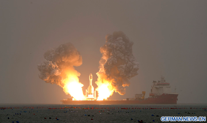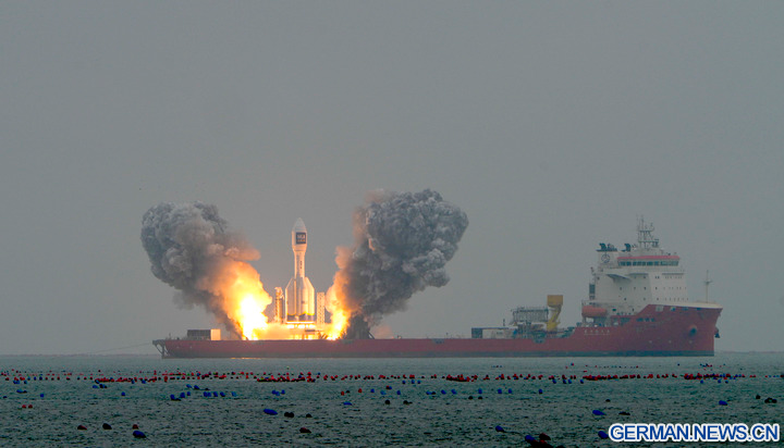 HAIYANG, 12. Oktober 2025 (Xinhua) -- Eine Trägerrakete vom Typ „Gravity-1“ startet mit einem Weitwinkel-Satelliten und zwei Versuchssatelliten von der Küste vor Haiyang in der ostchinesischen Provinz Shandong, 11. Oktober 2025. Die Rakete hob um 10:20 Uhr (Ortszeit Beijing) ab und brachte die drei Satelliten in ihre vorgesehenen Umlaufbahnen. Die Offshore-Mission wurde vom Taiyuan Satellite Launch Center durchgeführt.