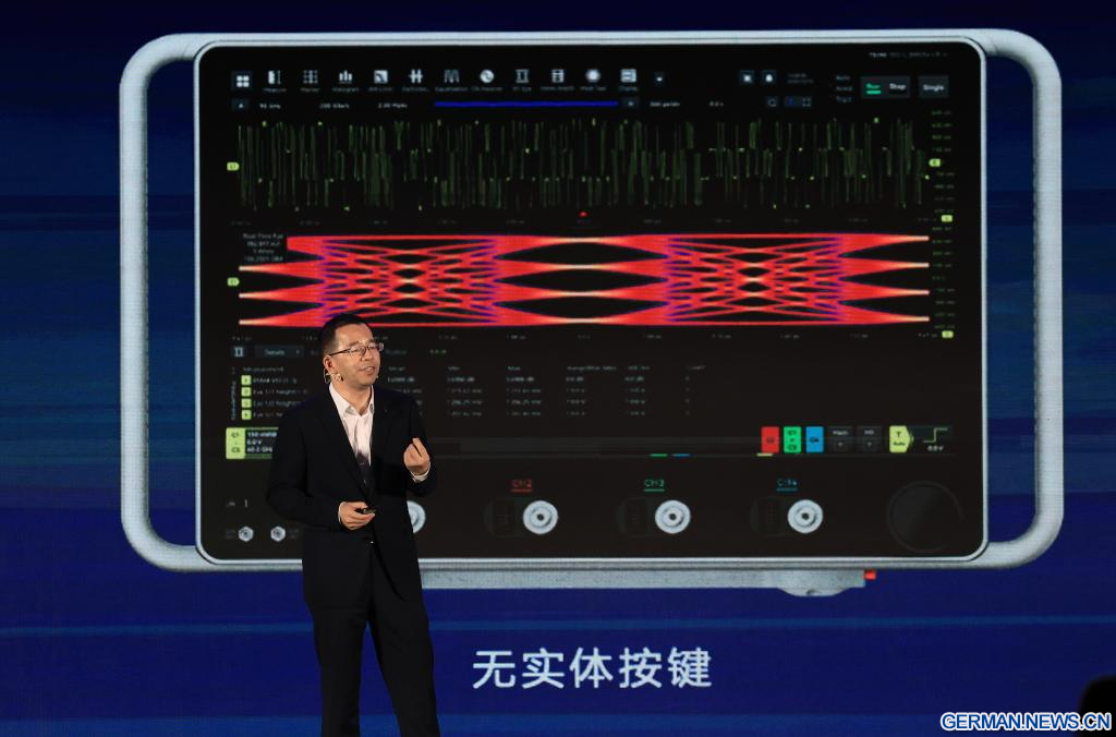 SHENZHEN, 15. Oktober 2025 (Xinhuanet) -- Liu Sang, CEO von Shenzhen Longsight Technologies Co., Ltd, stellt in Shenzhen in der südchinesischen Provinz Guangdong das 90-GHz-Ultrahochgeschwindigkeits-Echtzeit-Oszilloskop vor, 15. Oktober 2020. Chinas selbst entwickeltes 90-GHz-Ultrahochgeschwindigkeits-Echtzeit-Oszilloskop wurde am Mittwoch offiziell vorgestellt und gilt als Meilenstein in der globalen elektronischen Kommunikationsbranche.