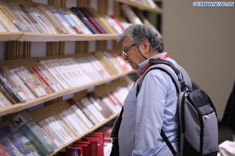 Ein Mann besucht den Stand von Reading China auf der Frankfurter Buchmesse in Frankfurt am Main, 16. Oktober 2025. Die weltweit größte Buchmesse, die Frankfurter Buchmesse, wurde am Dienstag mit dem Schwerpunkt auf Lizenz- und Rechtehandel eröffnet. (Xinhua/Du Zheyu)