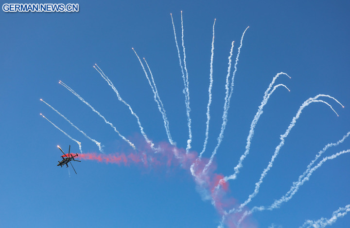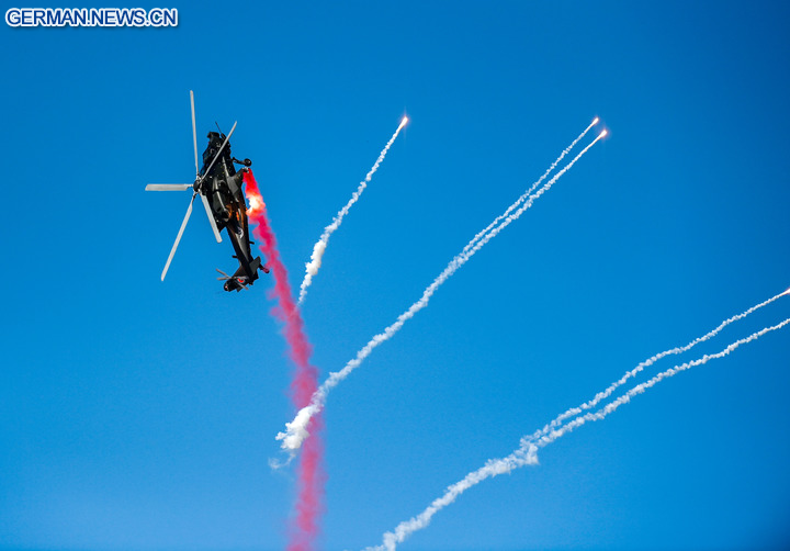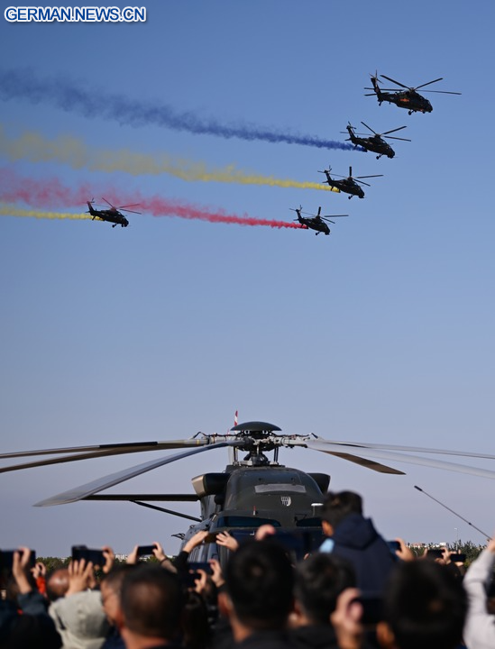 TIANJIN, 19. Oktober 2025 (Xinhua) -- Das Foto zeigt ein Hubschrauber vom Typ „Z-10“ bei einer Vorführung während der 7. China Helicopter Exposition in der nordchinesischen Stadt Tianjin, 18. Oktober 2025. Die Messe wurde am Samstag für die Öffentlichkeit geöffnet. (Xinhua/Zhao Zishuo)