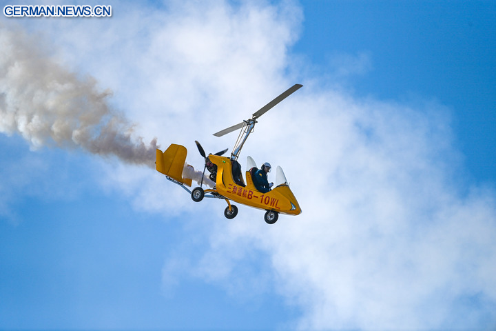 TIANJIN, 19. Oktober 2025 (Xinhua) -- Das Foto zeigt einen Gyrocopter bei einer Vorführung während der 7. China Helicopter Exposition in der nordchinesischen Stadt Tianjin, 18. Oktober 2025. Die Messe wurde am Samstag für die Öffentlichkeit geöffnet. (Xinhua/Zhao Zishuo)