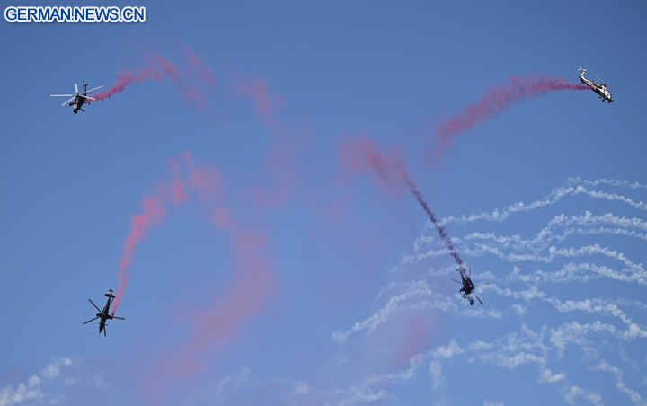 TIANJIN, 19. Oktober 2025 (Xinhua) -- Das Foto zeigt ein Hubschrauber vom Typ „Z-10“ bei einer Vorführung während der 7. China Helicopter Exposition in der nordchinesischen Stadt Tianjin, 18. Oktober 2025. Die Messe wurde am Samstag für die Öffentlichkeit geöffnet. (Xinhua/Sun Fanyue)