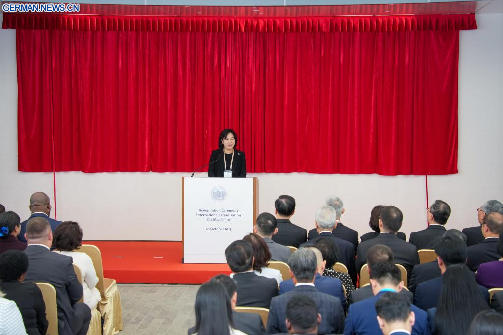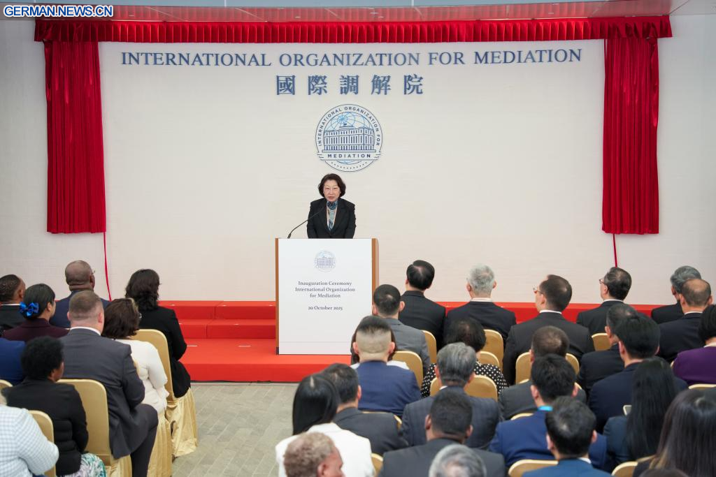 HONGKONG, 20. Oktober 2025 (Xinhuanet) -- Hua Chunying, stellvertretende Außenministerin Chinas, hält eine Rede bei der Eröffnungszeremonie der Internationalen Organisation für Mediation (IOMed) in Hongkong, Südchina, 20. Oktober 2025. Die Eröffnungszeremonie der IOMed, die ihren Sitz in der chinesischen Sonderverwaltungszone Hongkong (HKSAR) hat, fand am Montag hier statt.